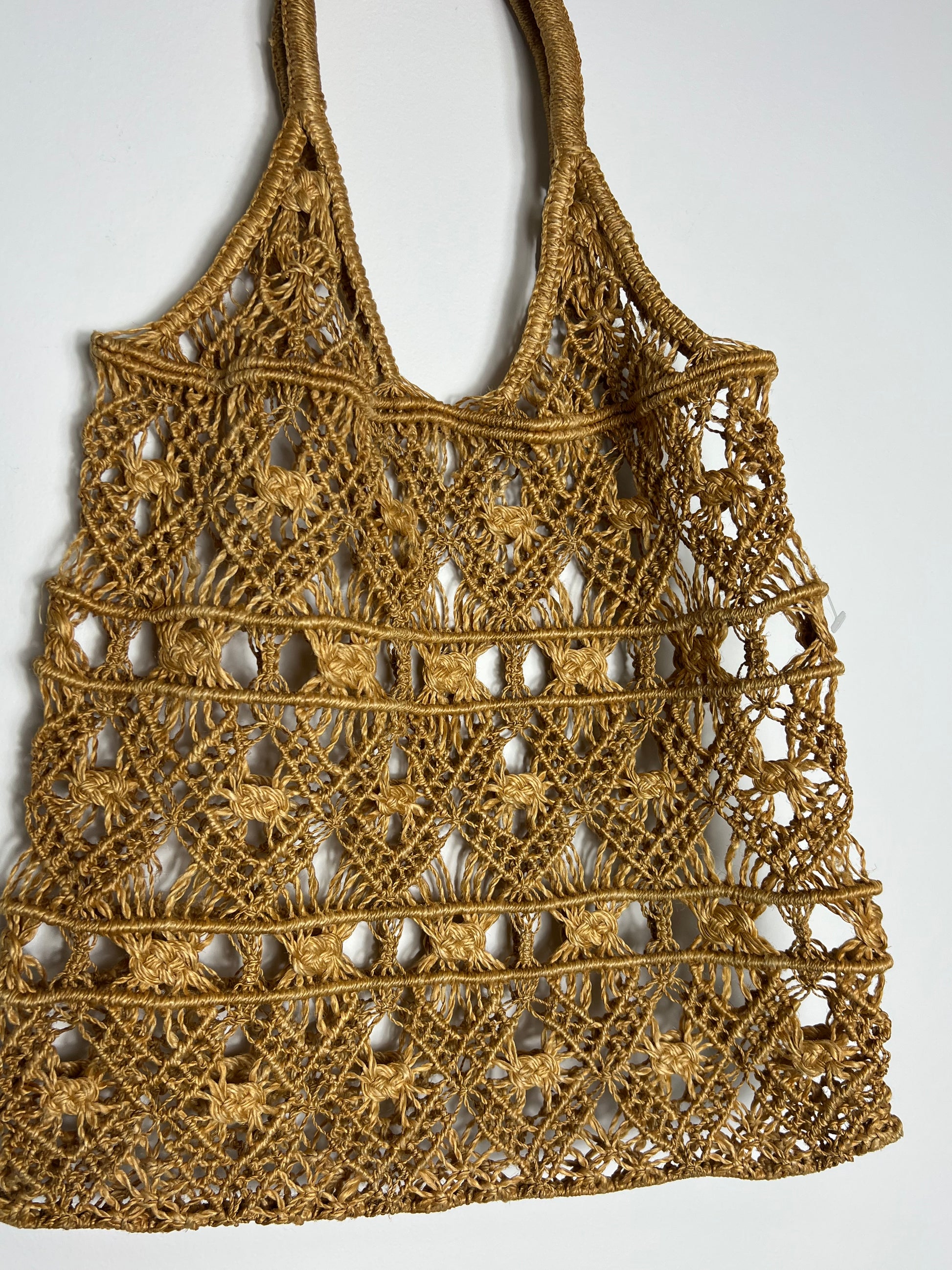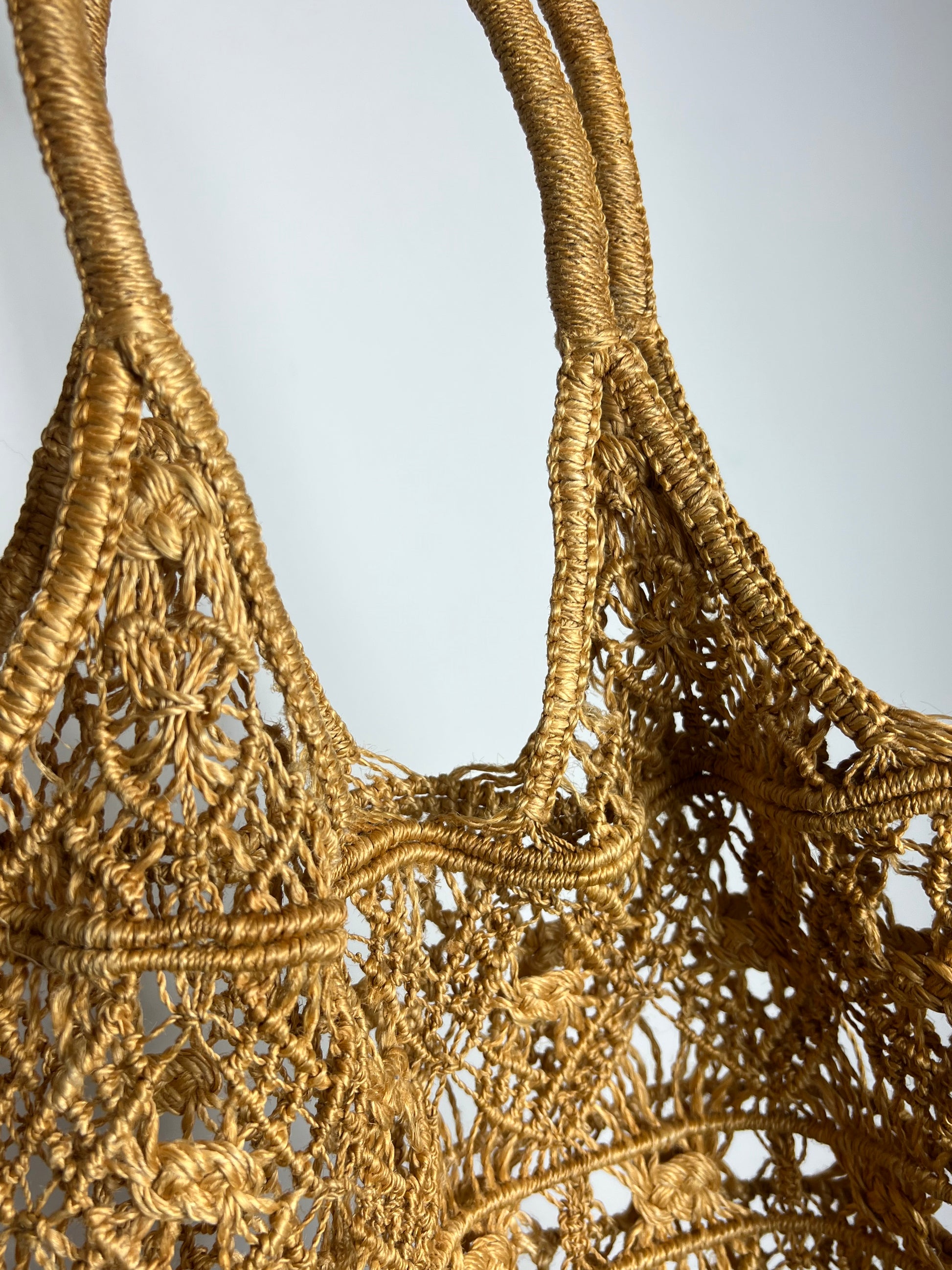 This vintage tote bag is handcrafted from woven jute, boasting a sturdy and durable construction. It is in excellent condition, making it an ideal choice for a beach trip or a visit to the farmers market.