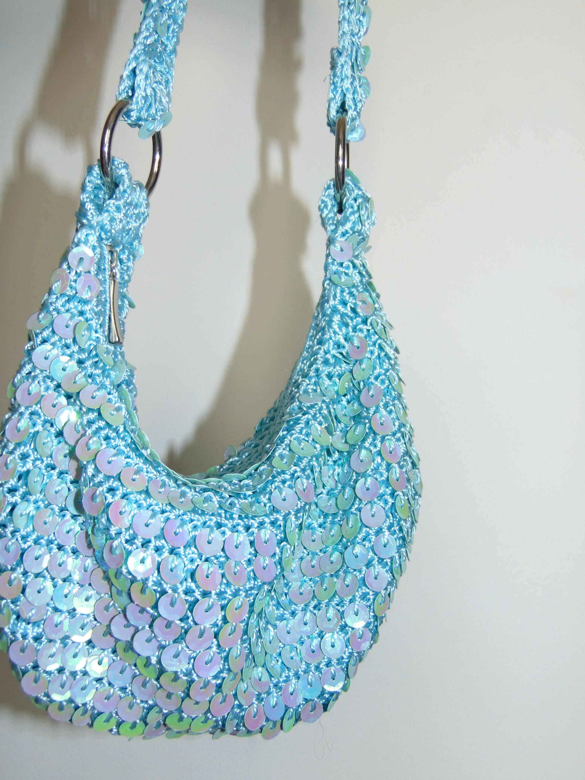 This 90s/Y2K bright baby blue sequin satchel is a dazzling throwback with sparkling sequins and shiny silver hardware. Perfect for adding a fun, retro flair to any outfit, it’s in excellent condition and ready to shine at your next event or night out.