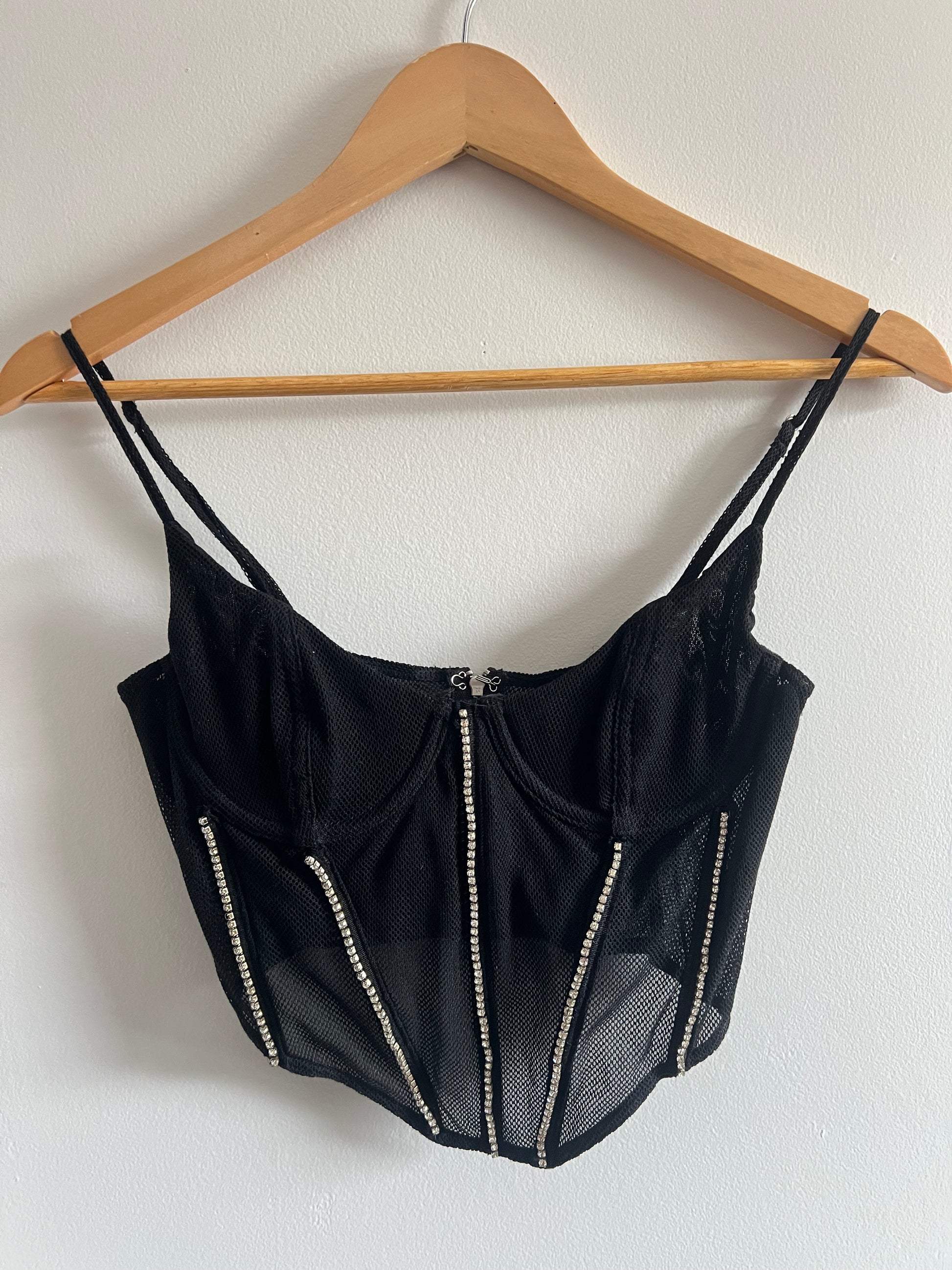 Black mesh bustier top with rhinestone ribbing and zipper closure back. No tags but fits an XS/S.
