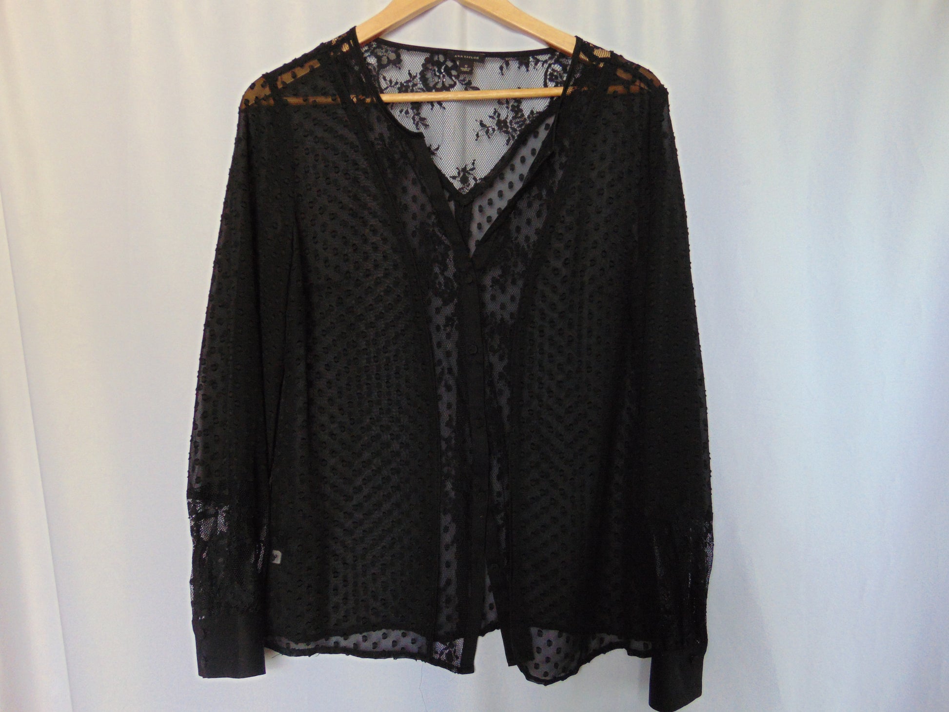 Vintage Ann Taylor - beautiful black sheer blouse with floral lace and polka dot pattern. 100% lace polyester. Tagged a size Small.
