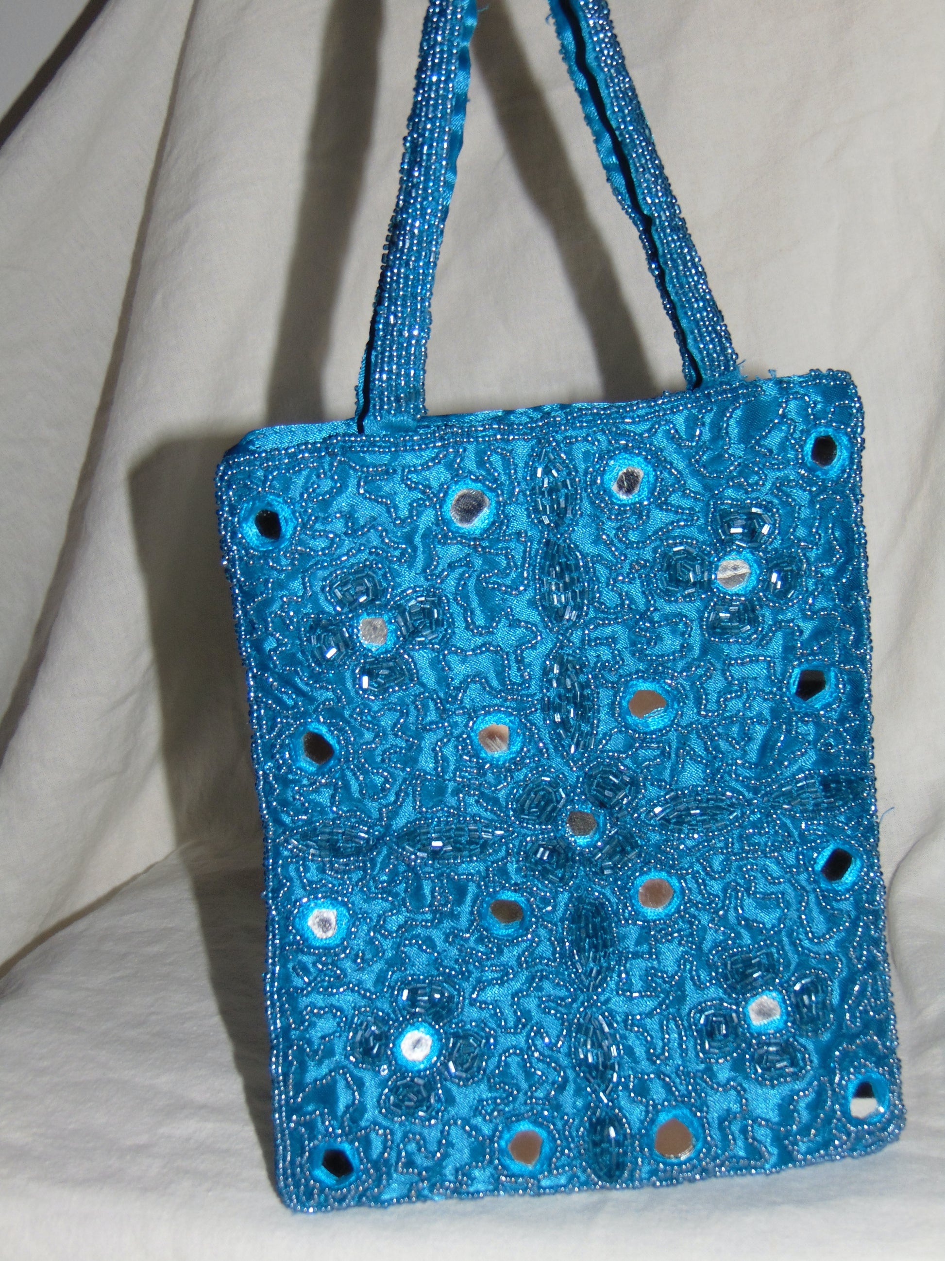 Beautiful blue, beaded silk tote handbag featuring a gorgeous traditional Indian Shisha embroidery made of florals and mirrors. Handcrafted in India.