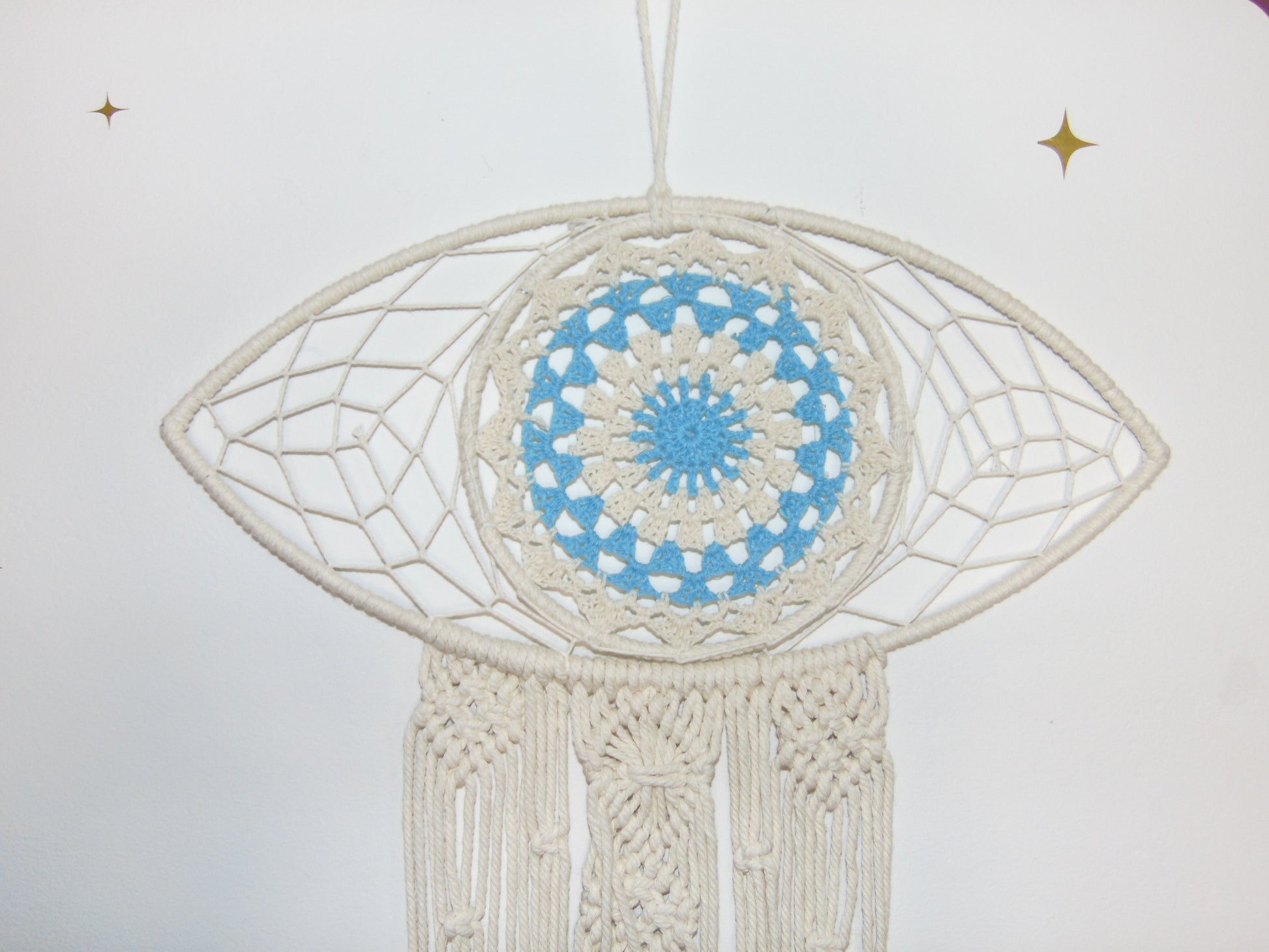 May every evil eye go blind. Protect your energy and decorate your space with this beautifully handmade, eco-friendly cotton macrame evil eye.