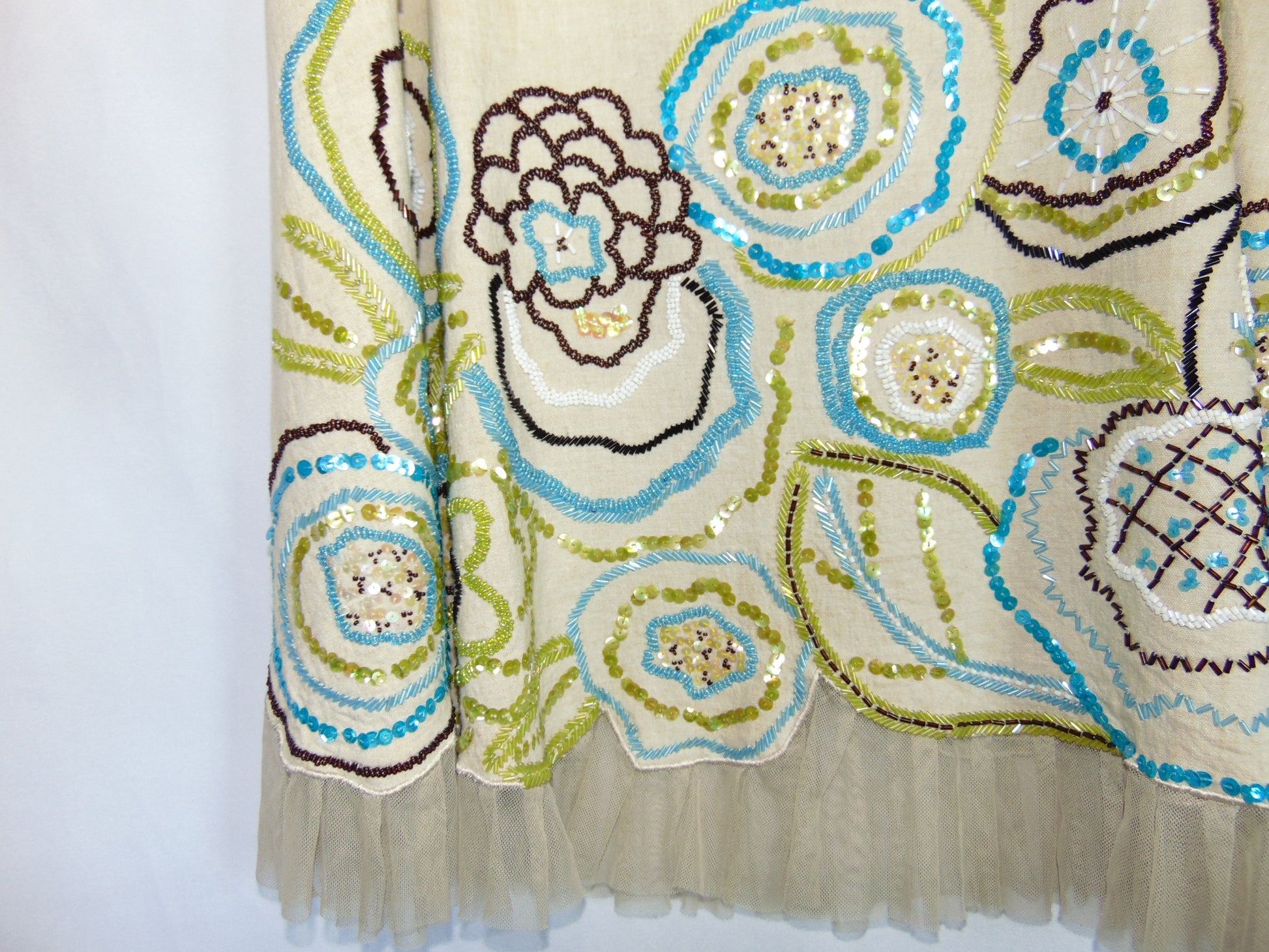 The details in this skirt are absolutely beautiful. Vintage Basil & Maude linen skirt with tule trim and a handbeaded floral design. Tagged a size 6. 55% Linen, 42% Rayon, 3% Spandex.