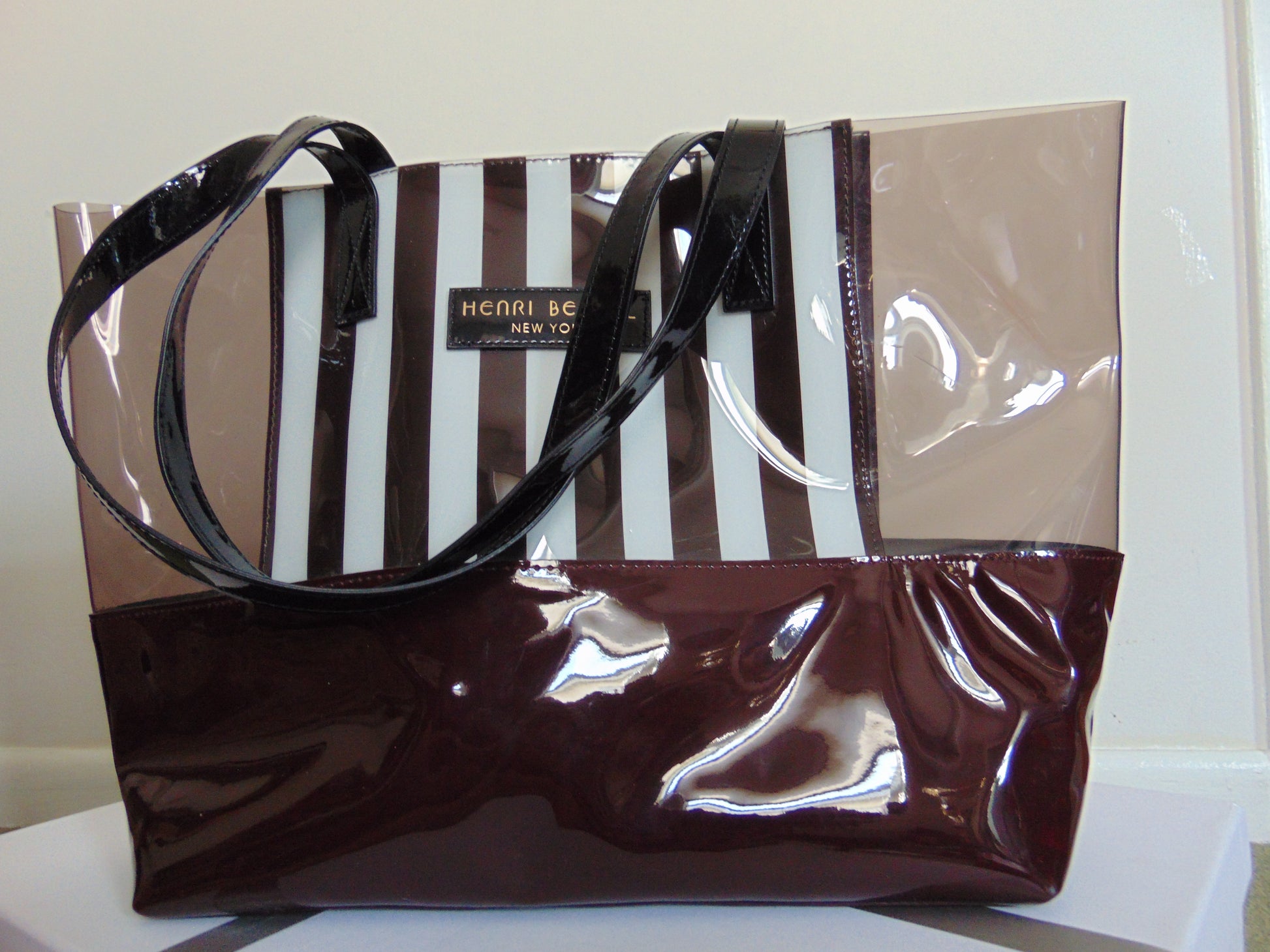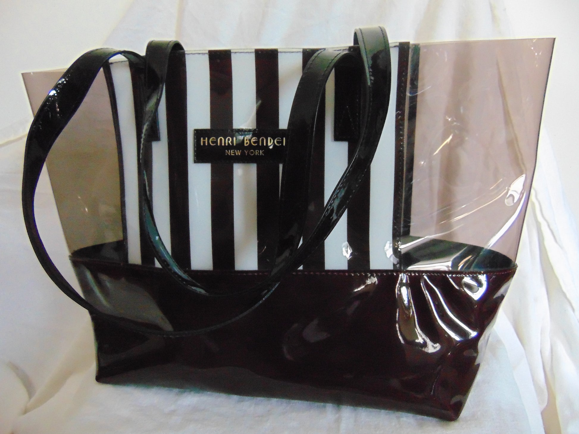 This medium sized pvc Henri Bendel tote bag is perfect for any occasion! A trip to the beach, a day full of errands or even for your commute to work, be sure to do so in style. PVC exterior with a patent leather trim. Double patent leather straps with an approximate 10" drop. Measuring at 11" tall, 13" wide with a 5" depth.