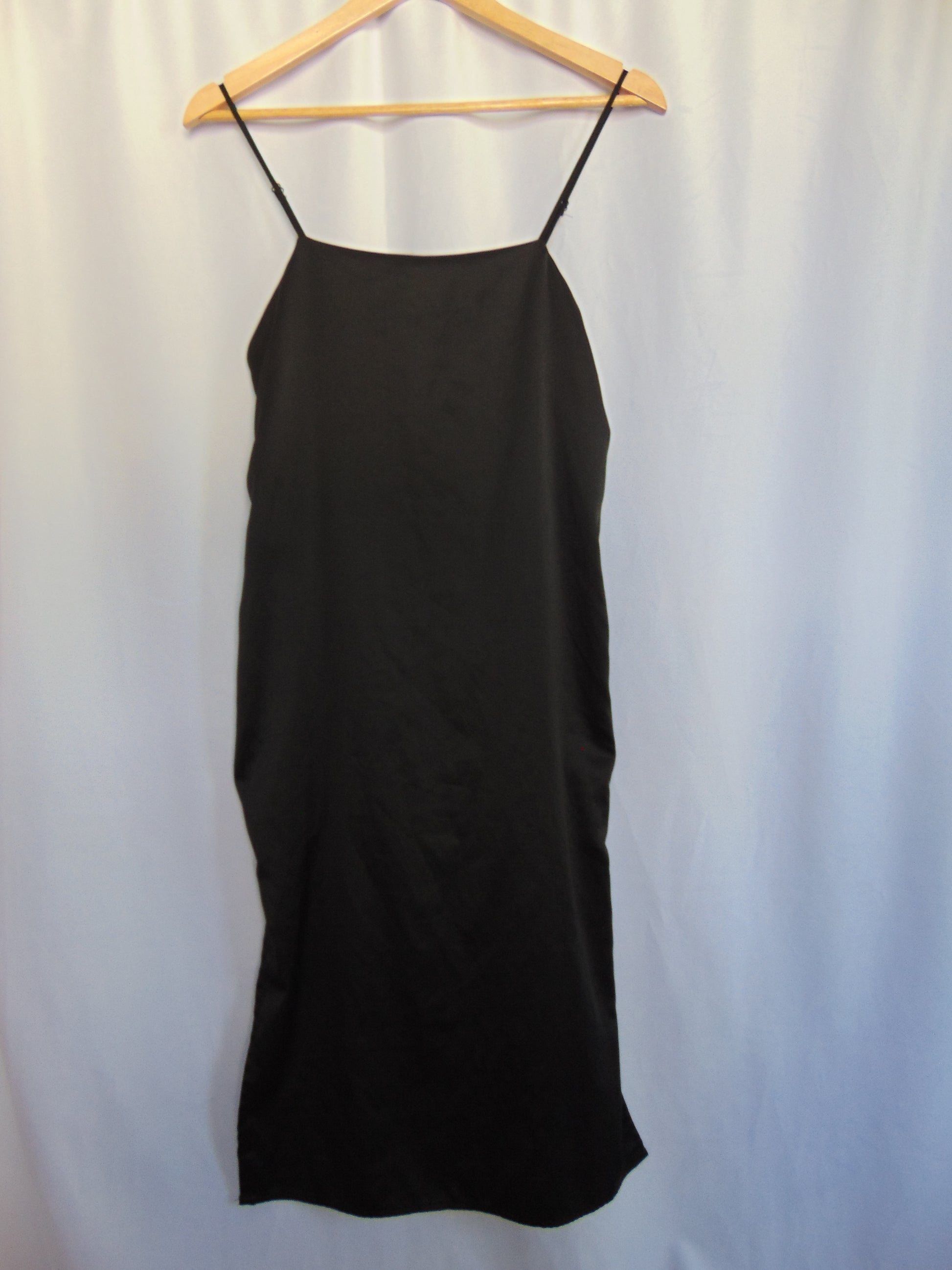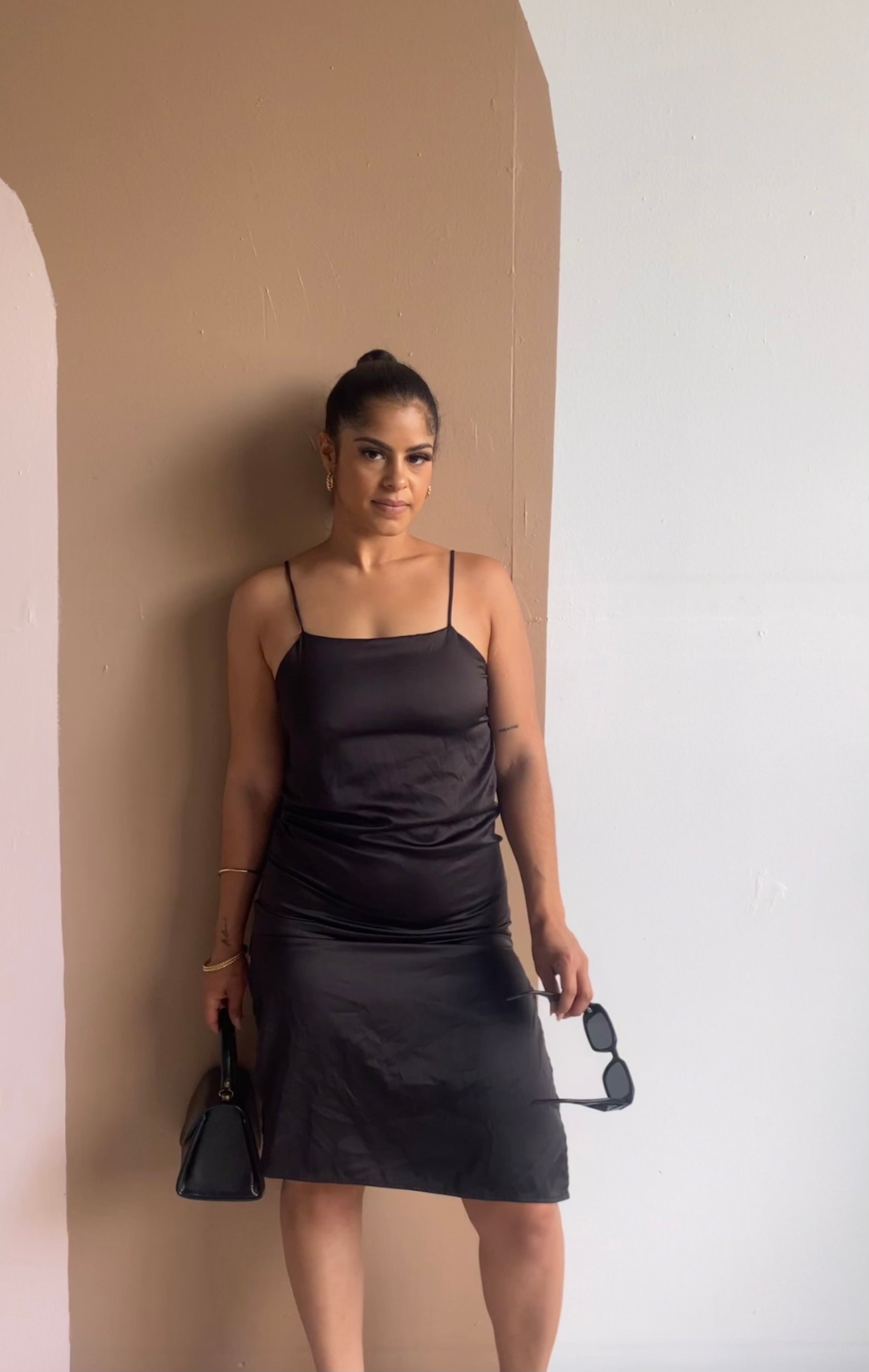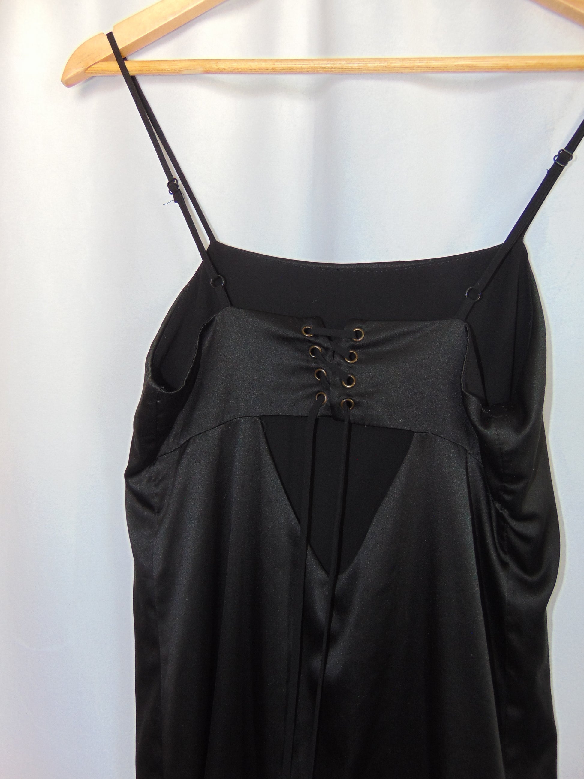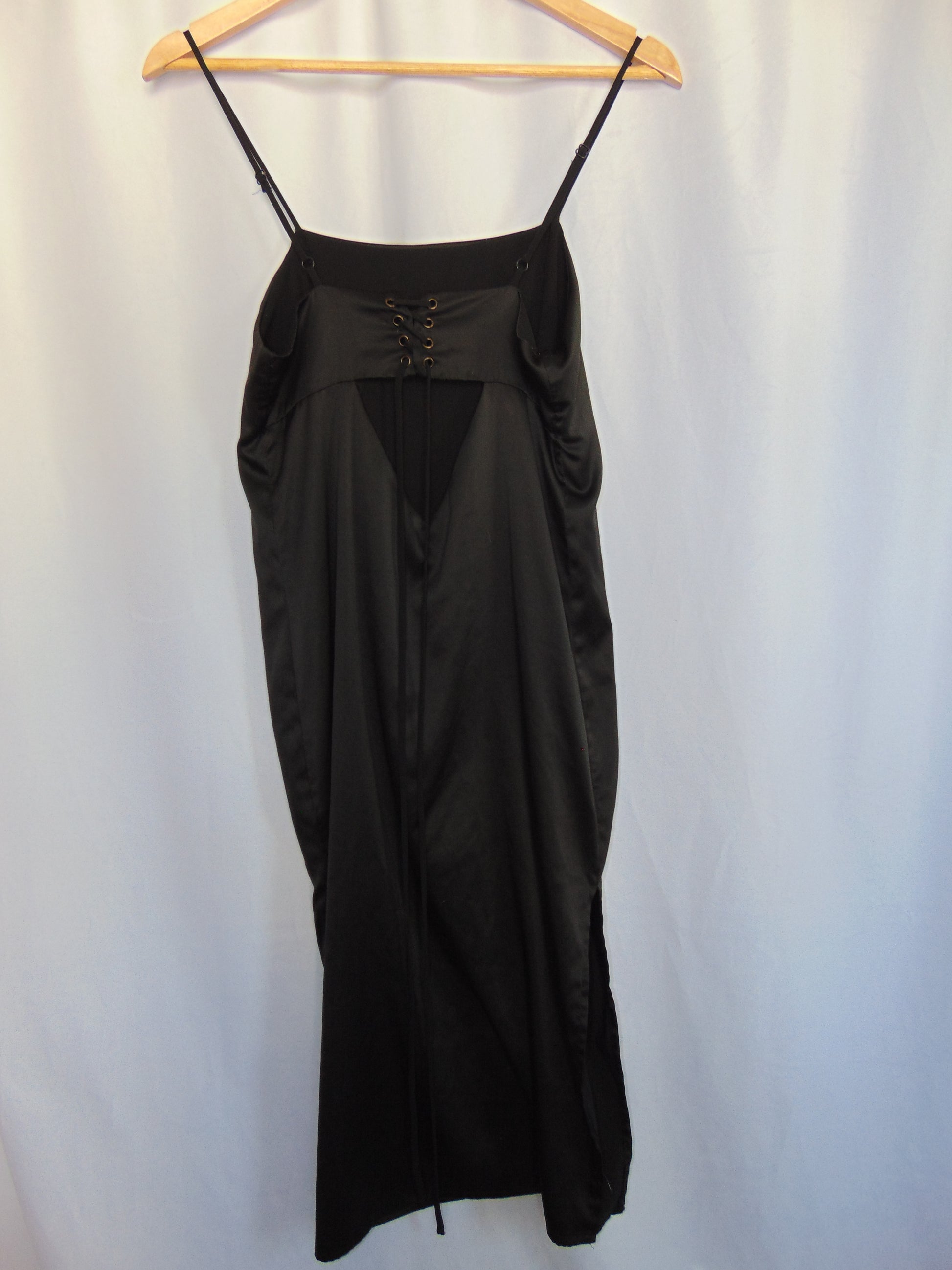 This little black dress is a total showstopper. Crafted from silky fabric, it flaunts side slits for effortless strutting and a playful lace-up back with a sexy little cutout.