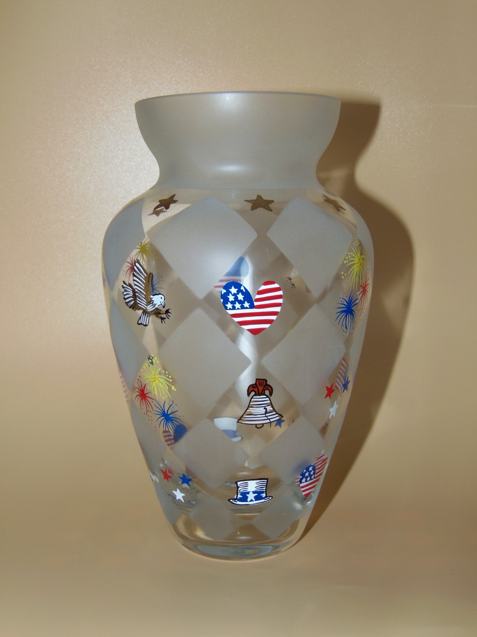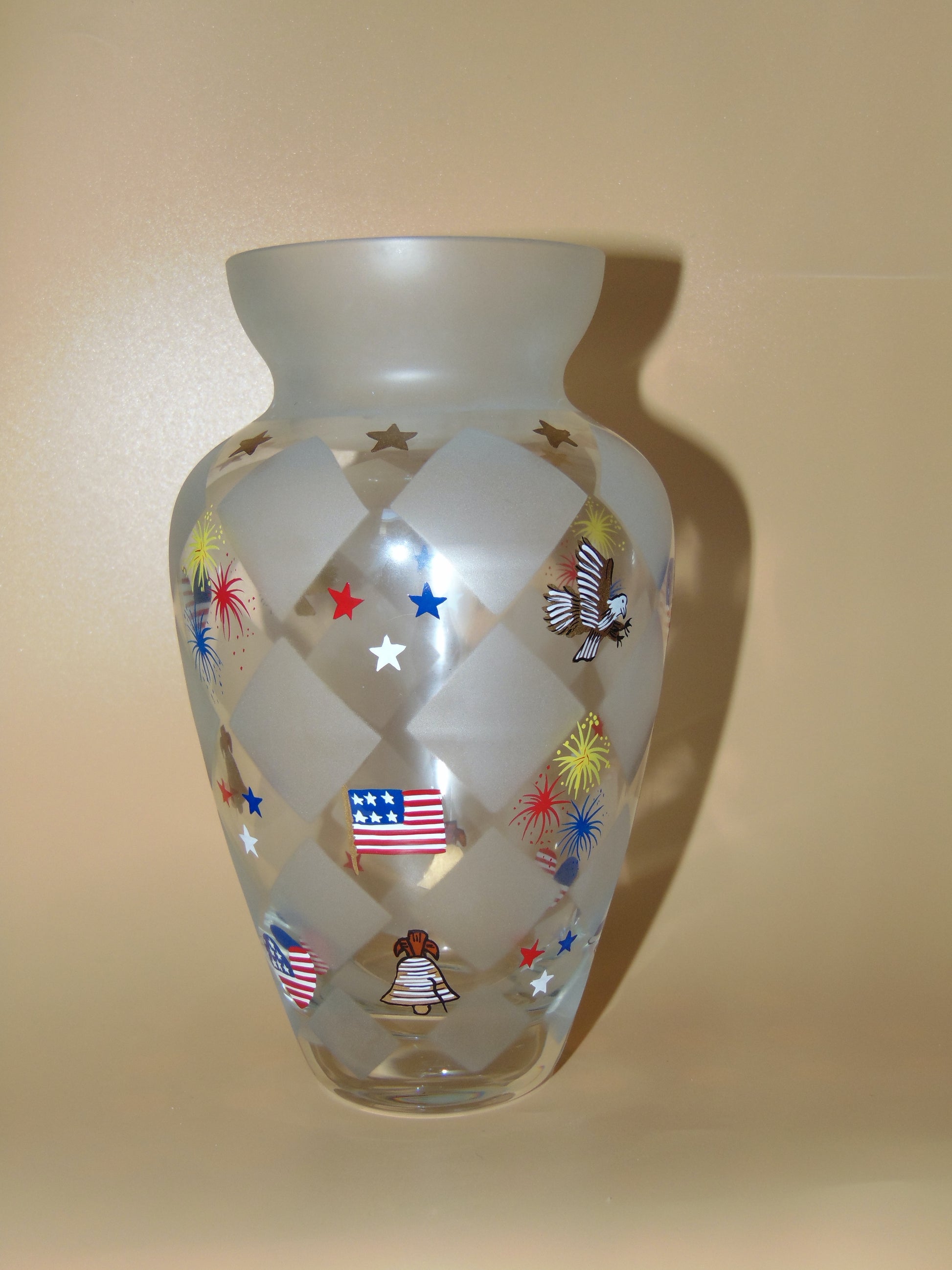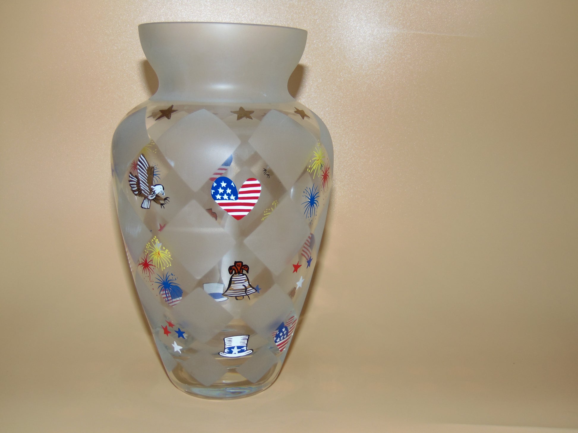 Lenox Patriotic Splendor glass vase. About 8.5" tall. Hand painted, made in Romania. Not suitable for dishwasher, hand wash gently.