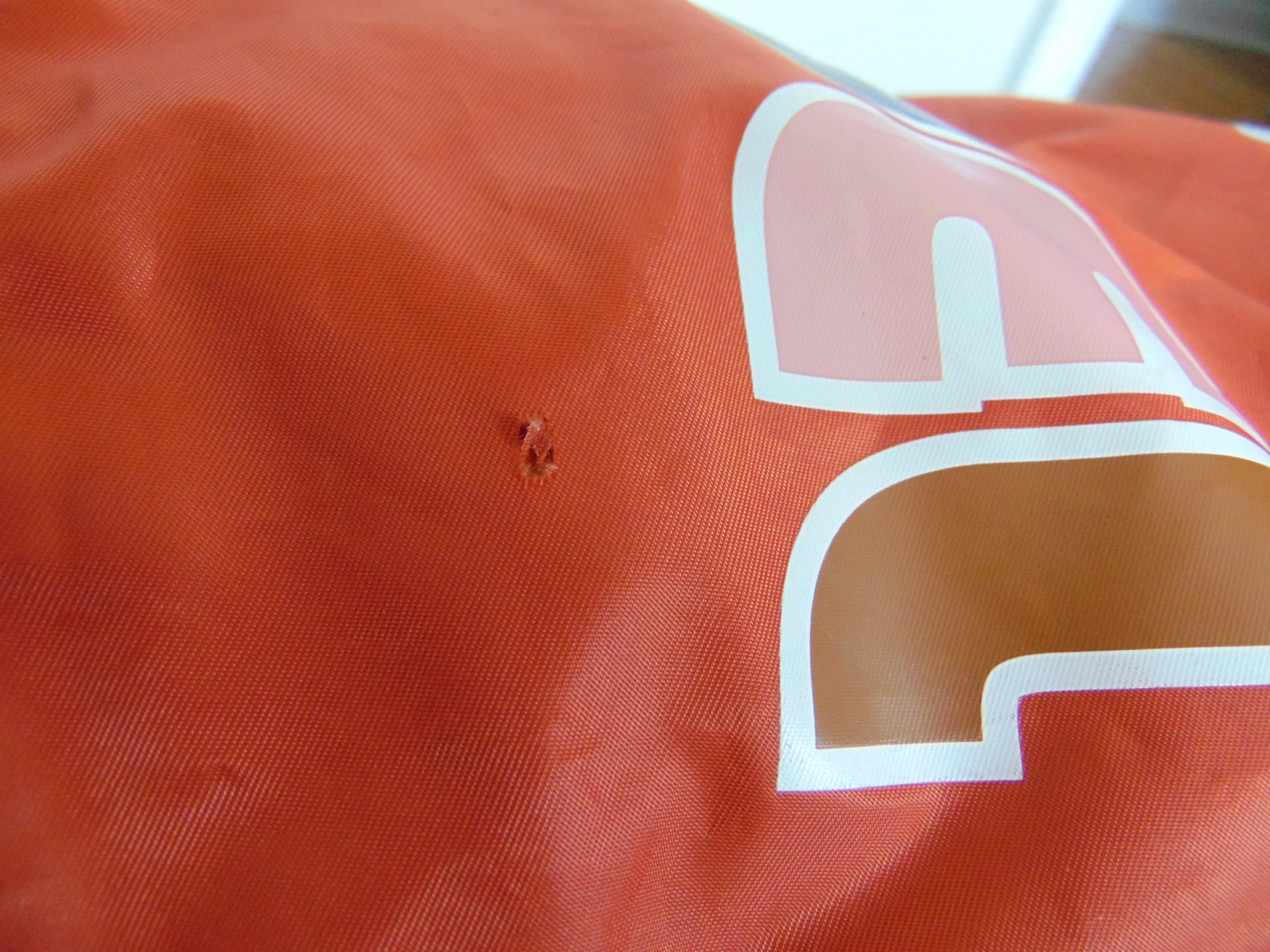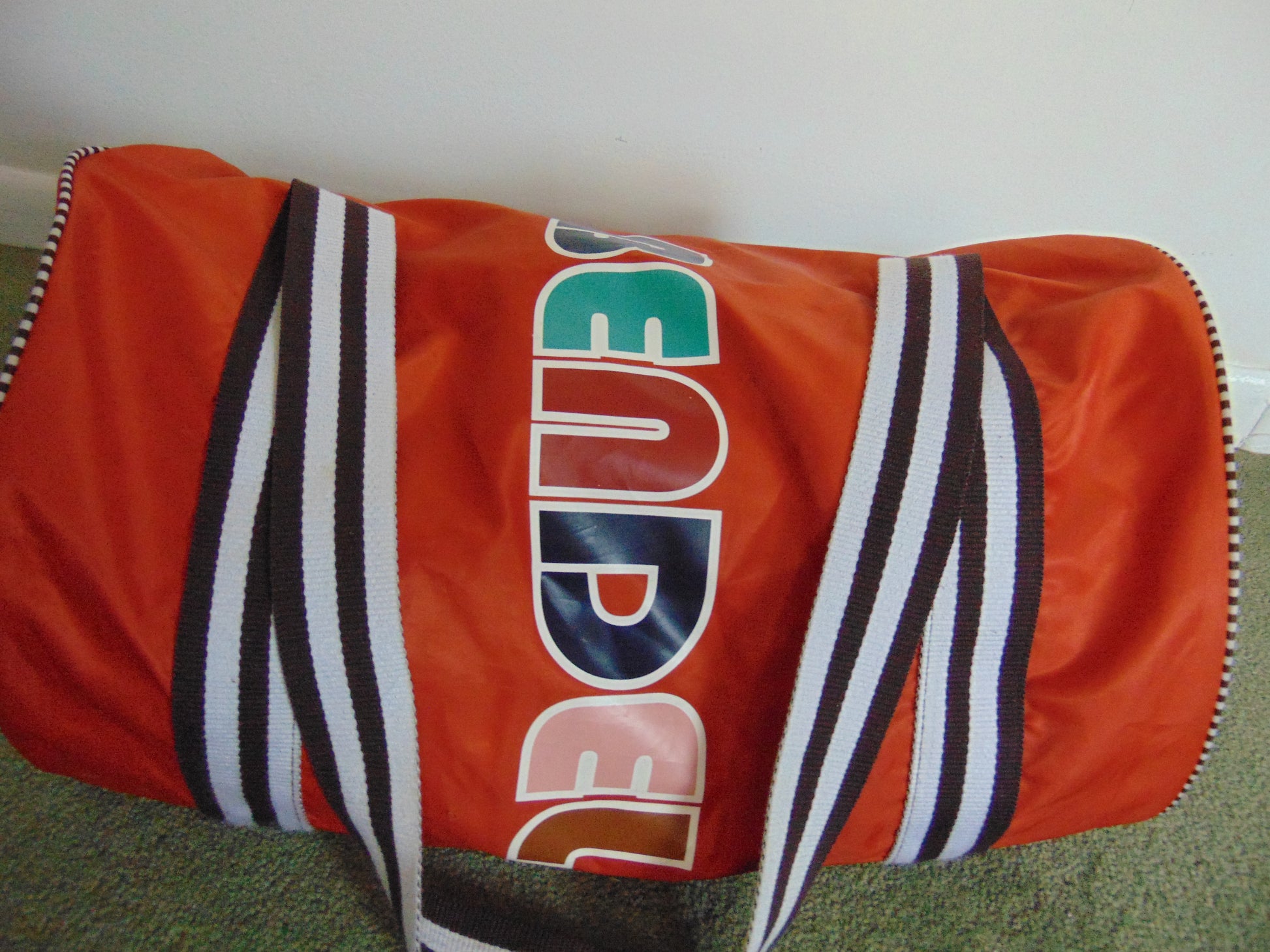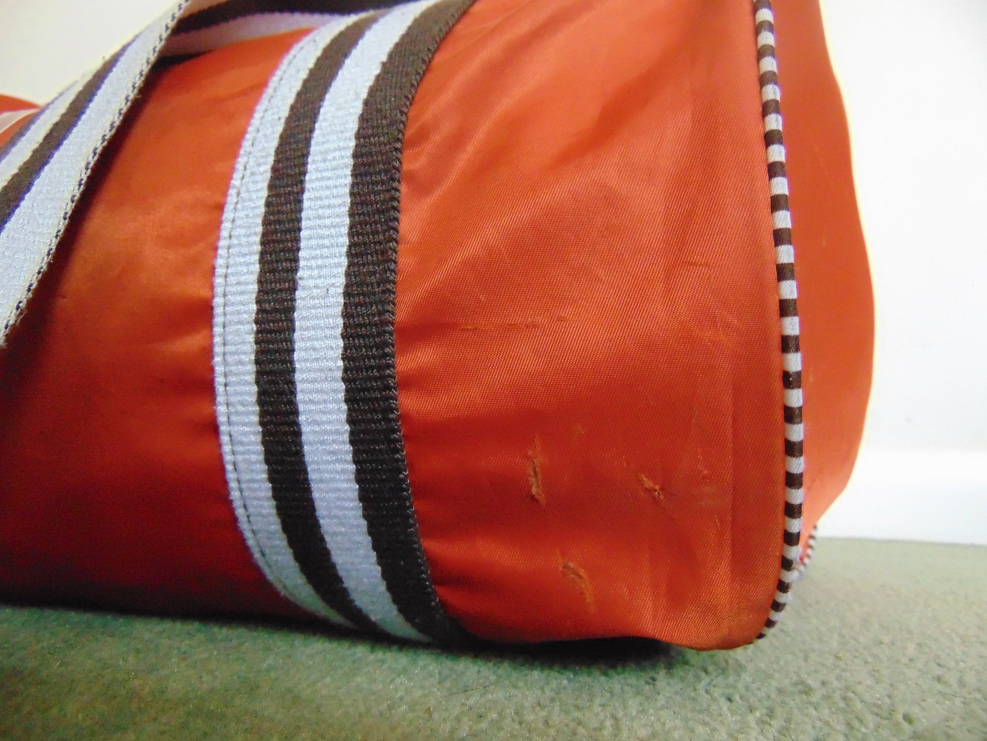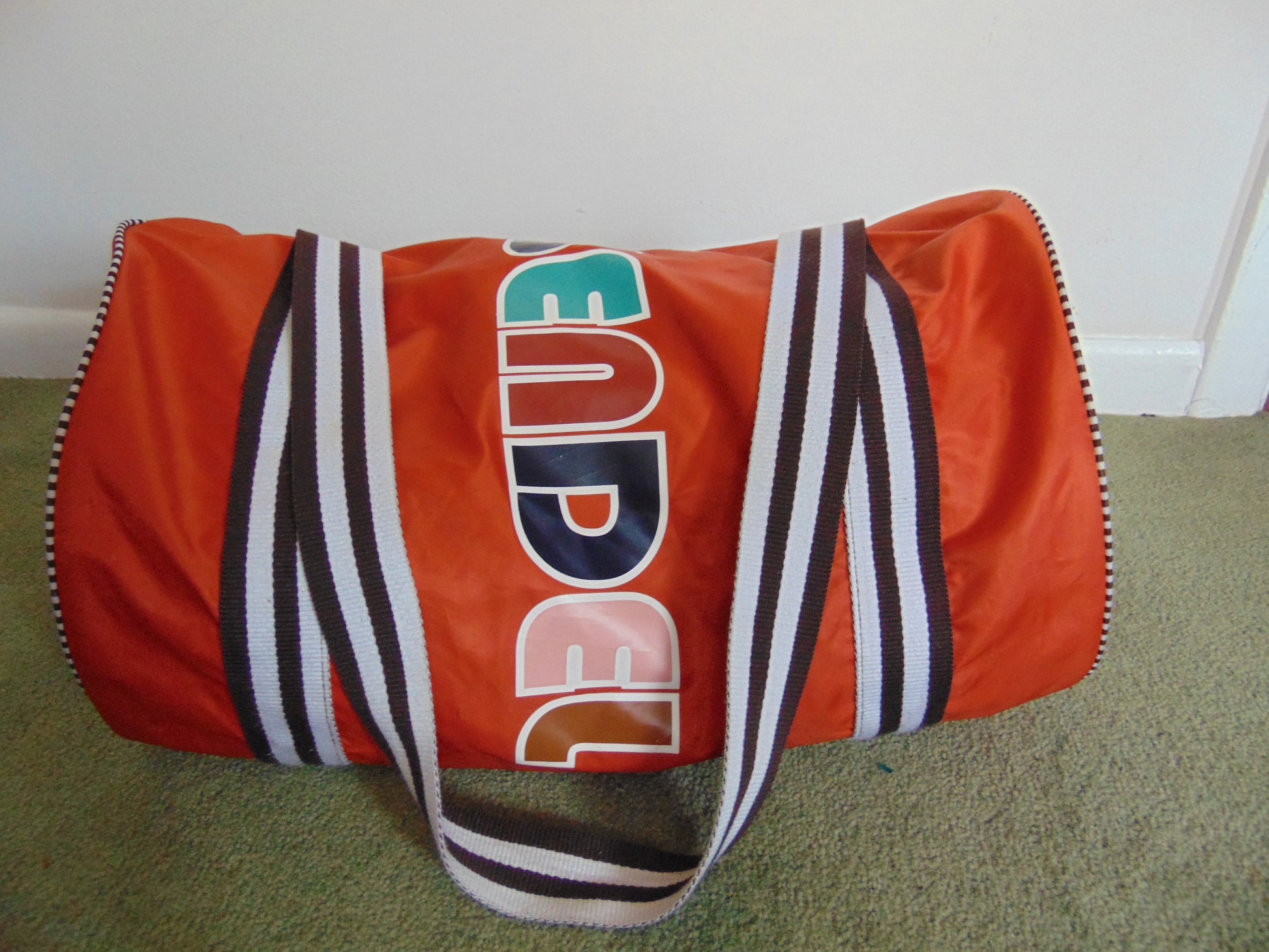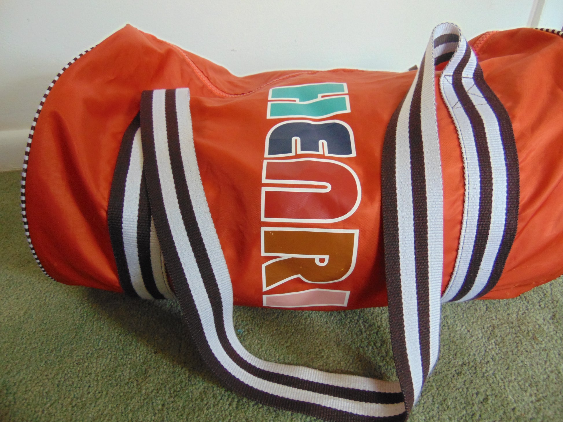 Limited Edition Henri Bendel orange nylon lightweight duffel gym/weekend bag with the iconic centennial stripe handles. This bag is perfect for a summer weekend getaway with the bright block letter logo and striped piping edges. Measuring at approximately 17" x 10".