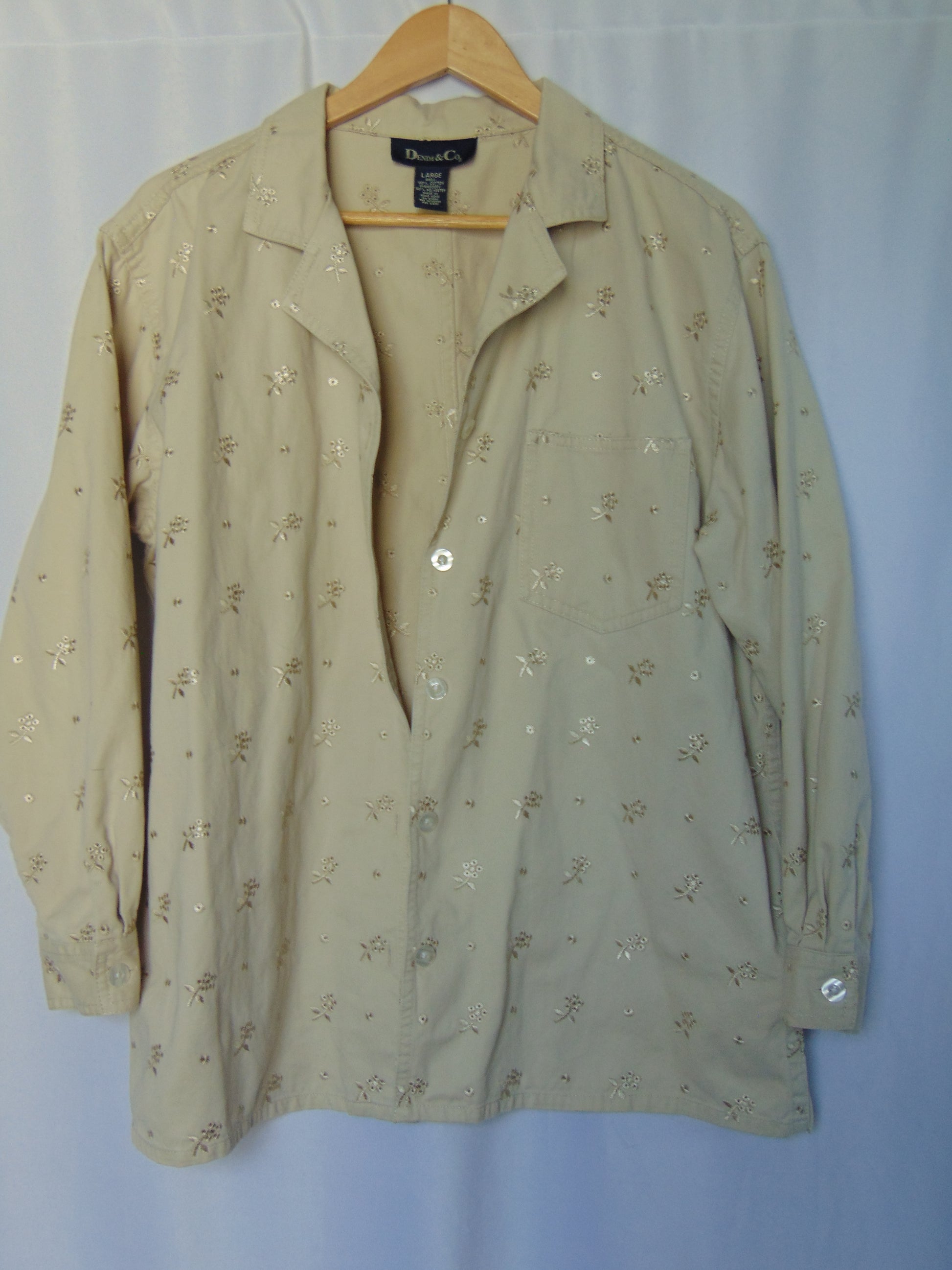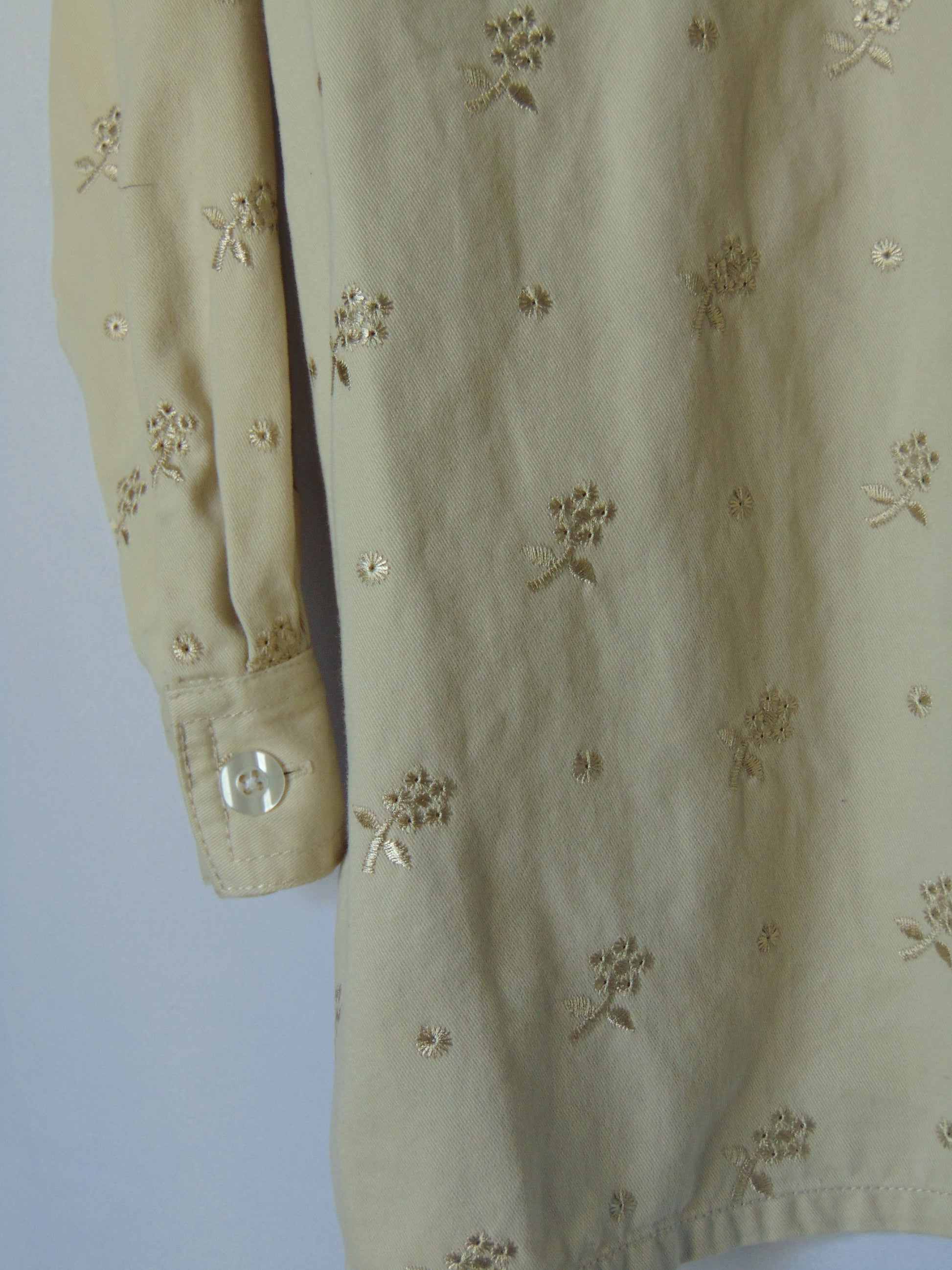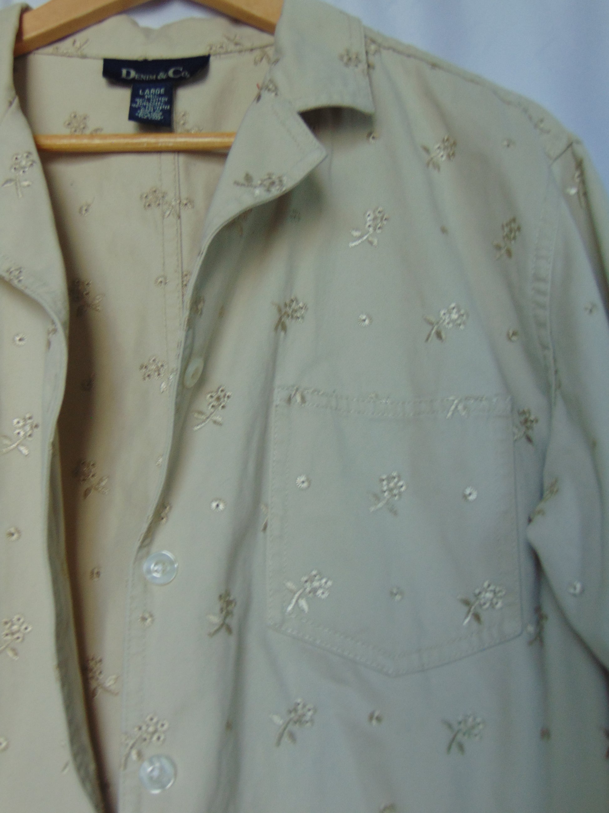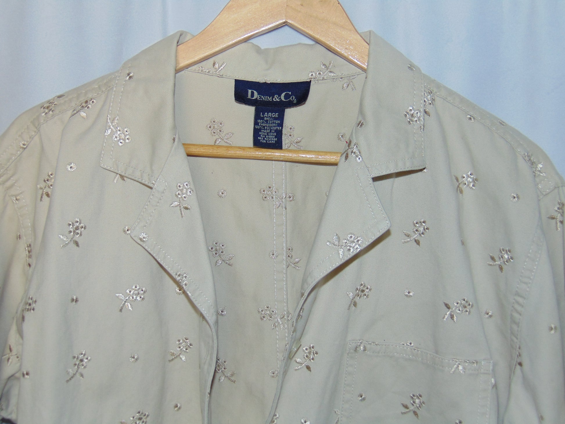 100% COTTON VINTAGE FLORAL EMBROIDERED SHACKET BY DENIM & CO. TAGGED A SIZE LARGE.