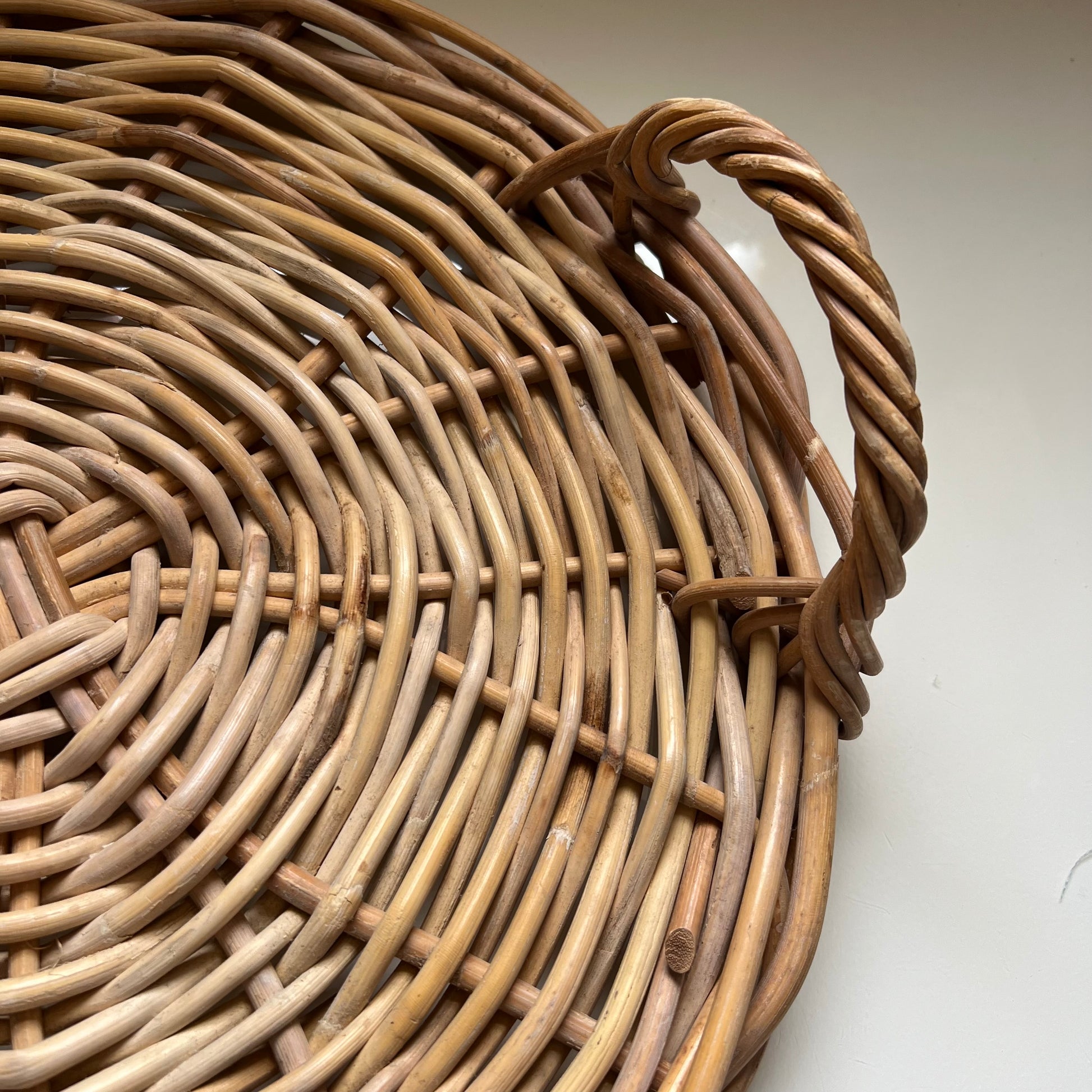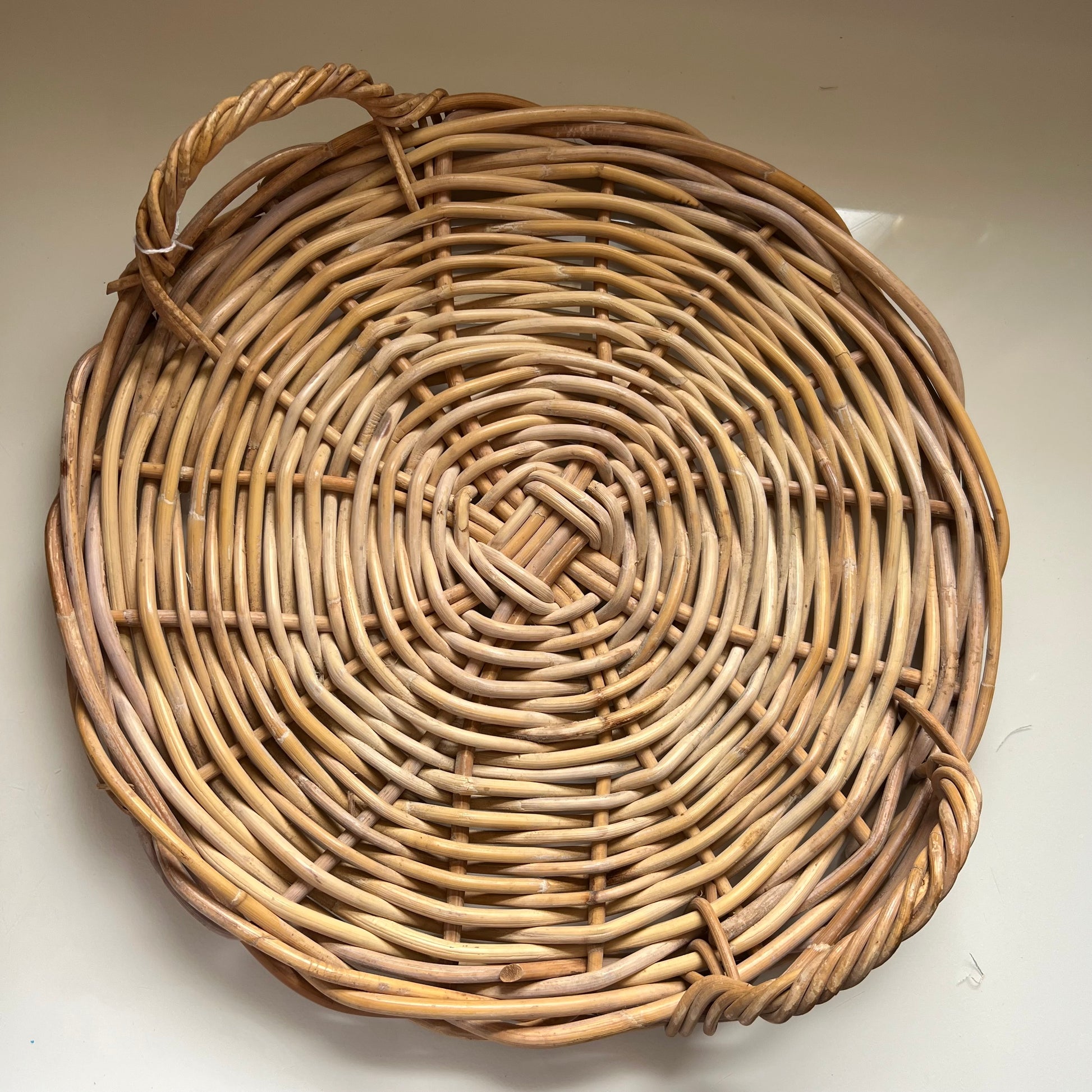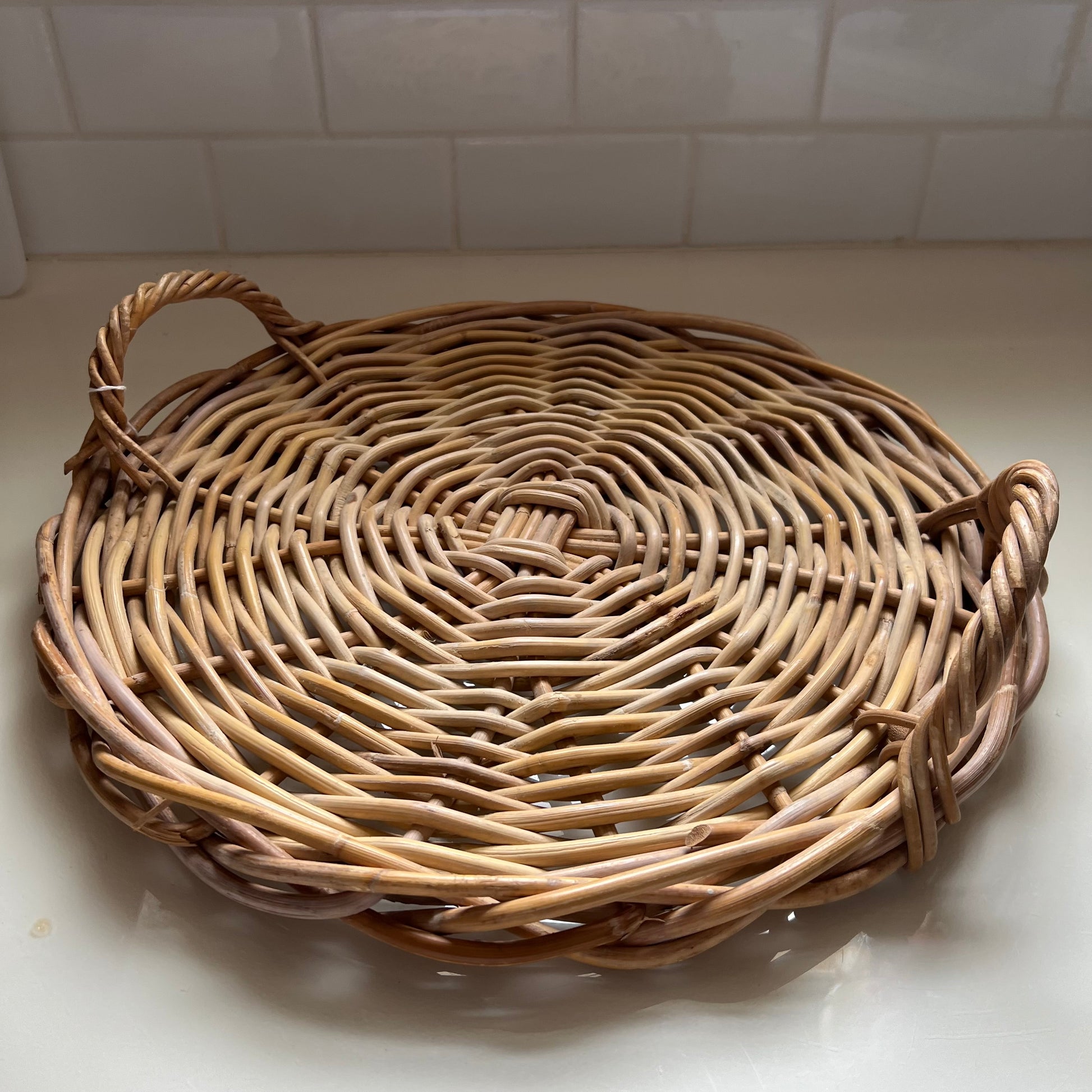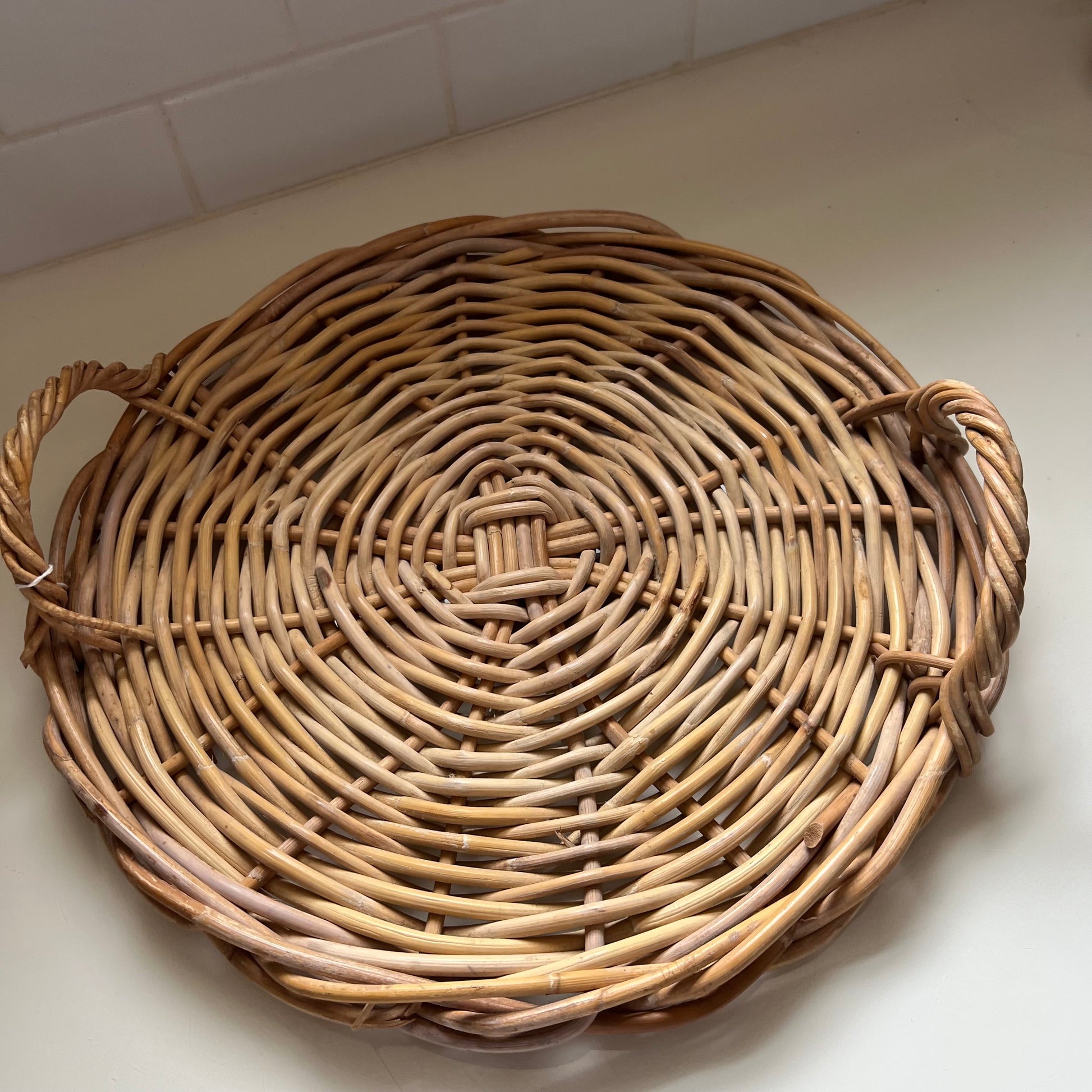 Bamboo wicker braided serving tray with handles. This tray looks delicate but is actually extremely sturdy.