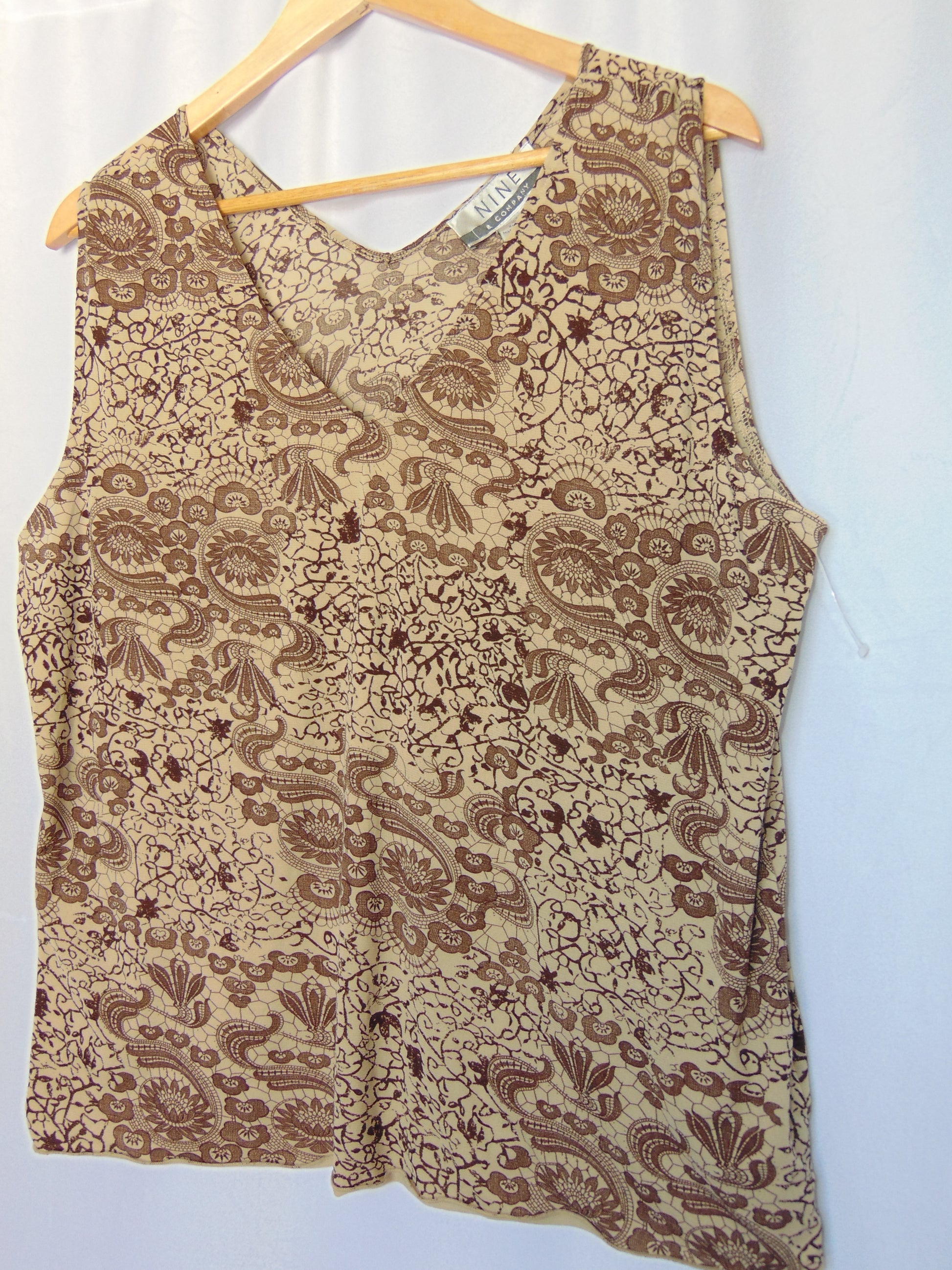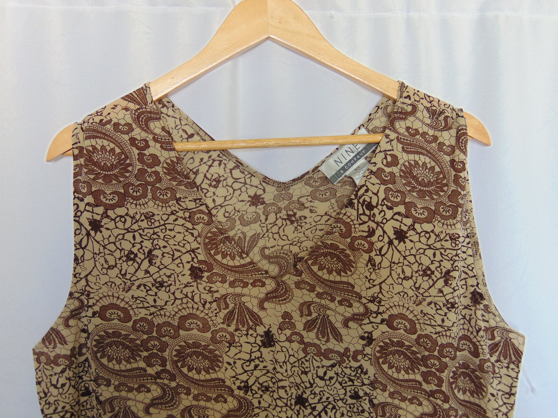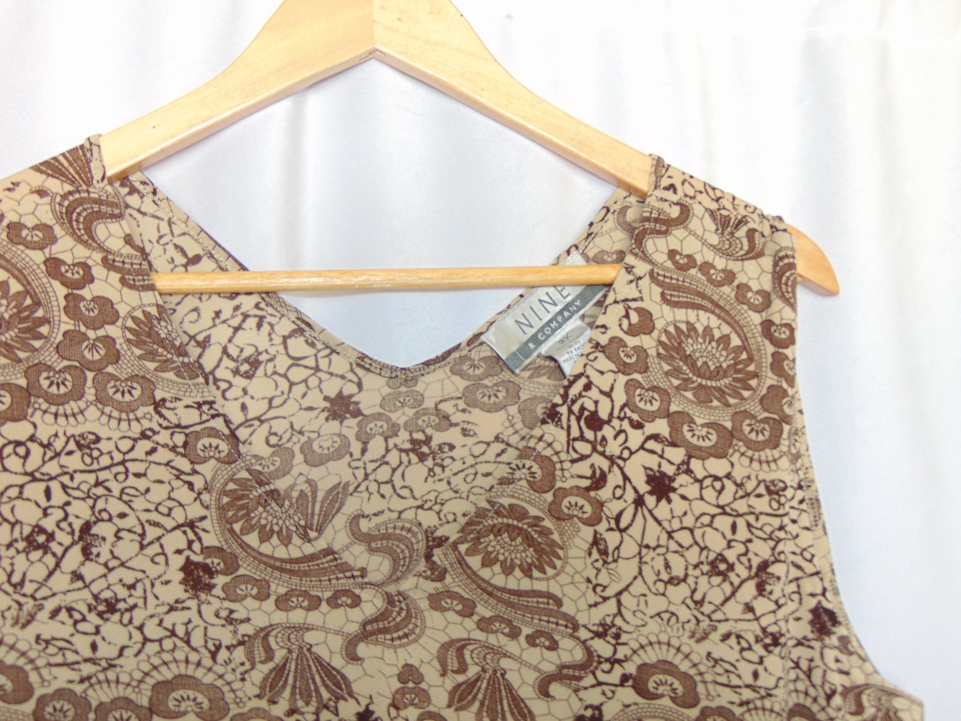 Beautiful shades of brown paisley, mesh vintage Nine & Company top. Material is 100% nylon with lots of stretch. Tagged a size 2X.
