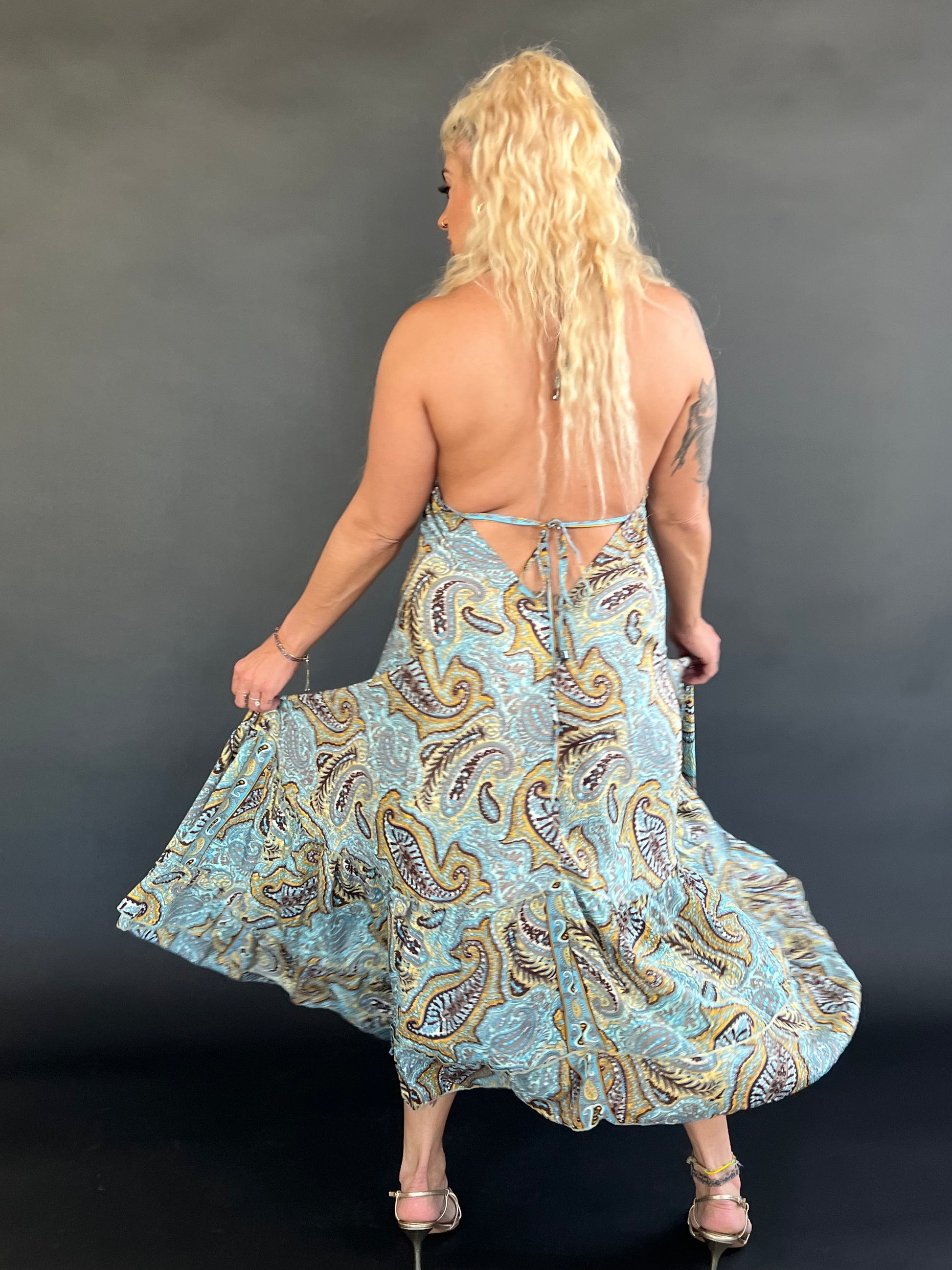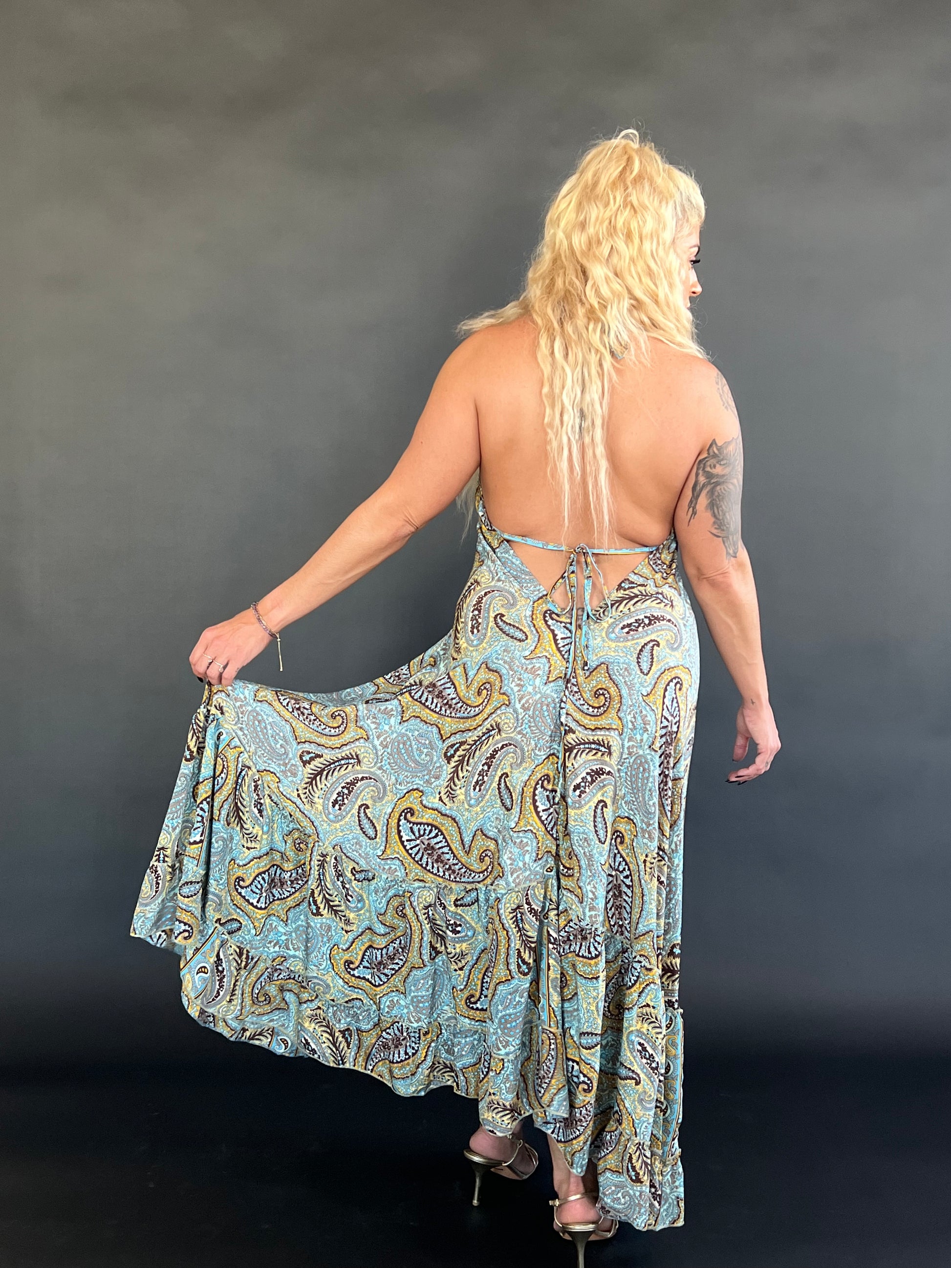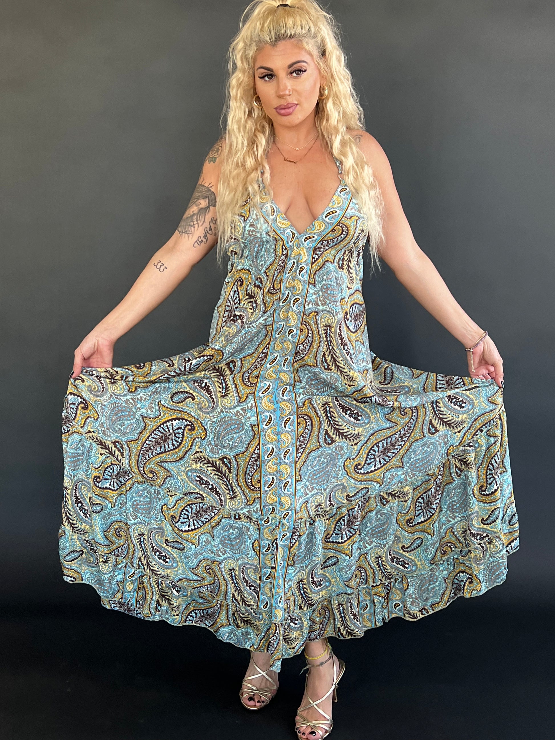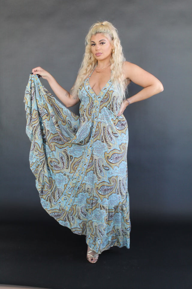 This dress is definitely one to remember! Beautiful blue, brown and golden yellow paisley print dress with a deep v cut halter neck and low cut back. Flowy frill bottom and silver hardware, not a detail was missed on this one.