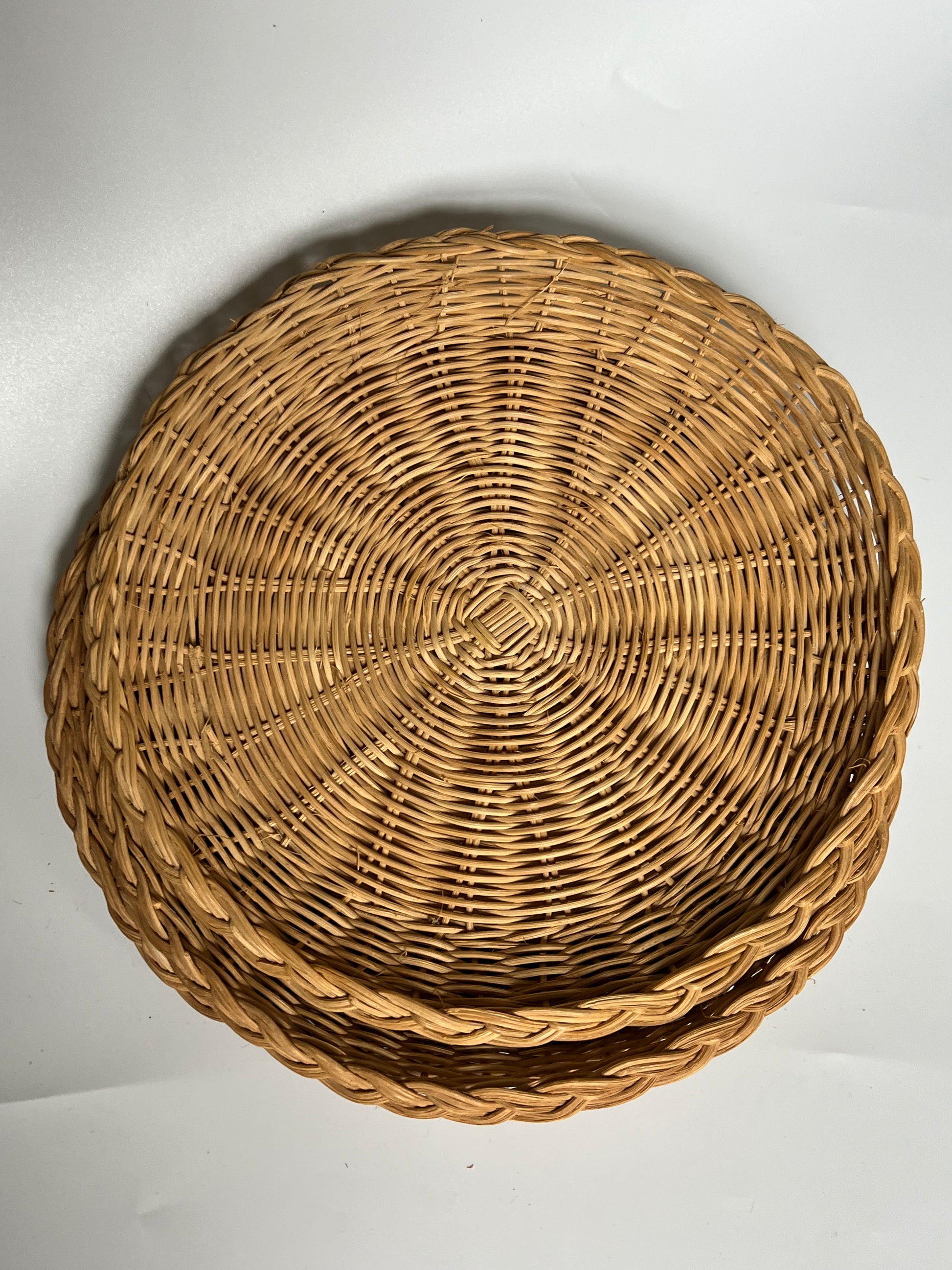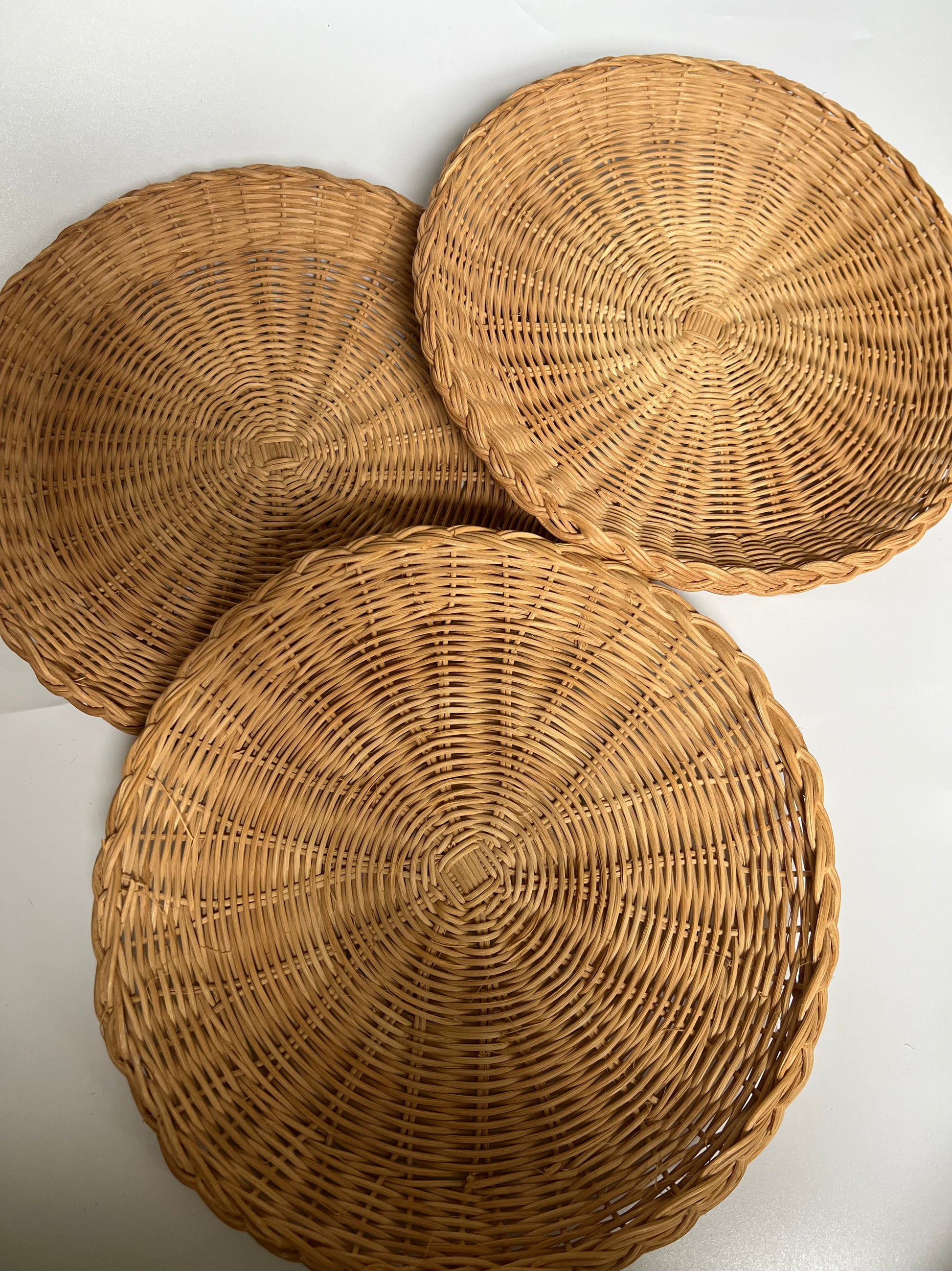Set of 3, vintage wicker 10” charging plates.