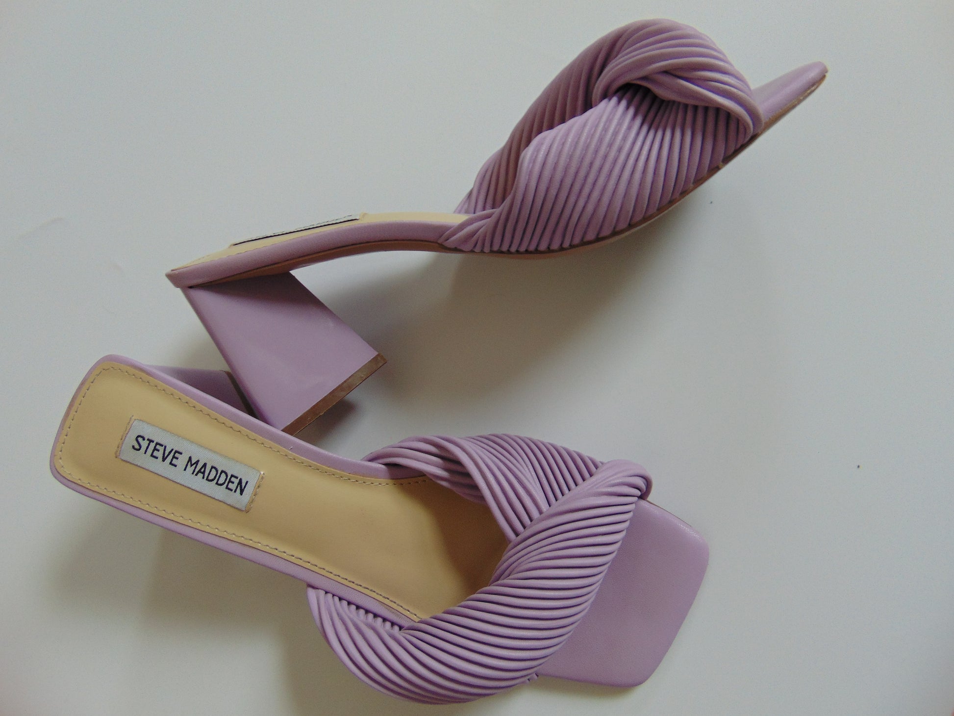 Steve Madden "Evela" heeled sandals in the prettiest lavender color. The soles show gentle wear but these beauties are in excellent condition. 3" block heel with a soft and stretchy upper material.
