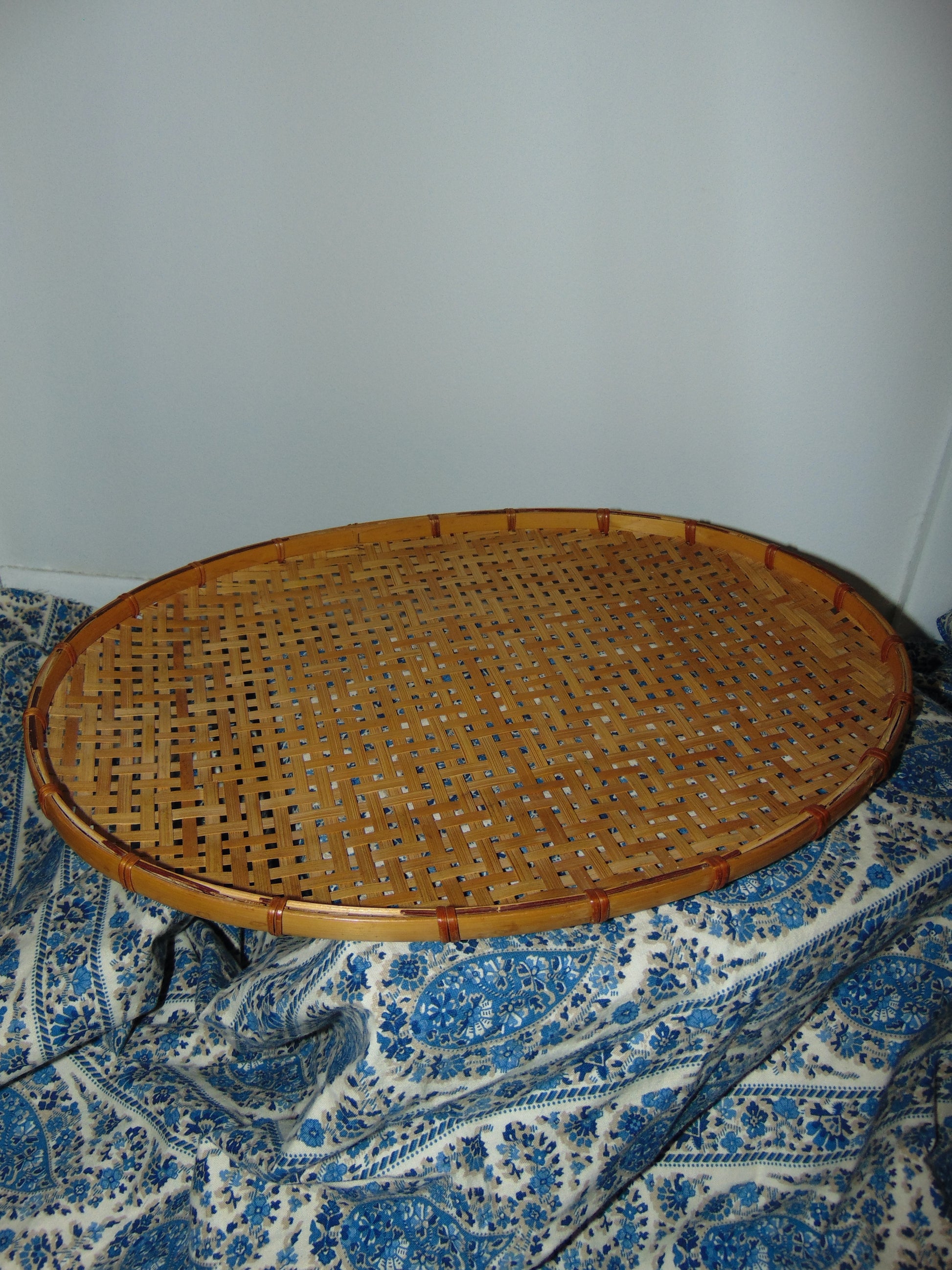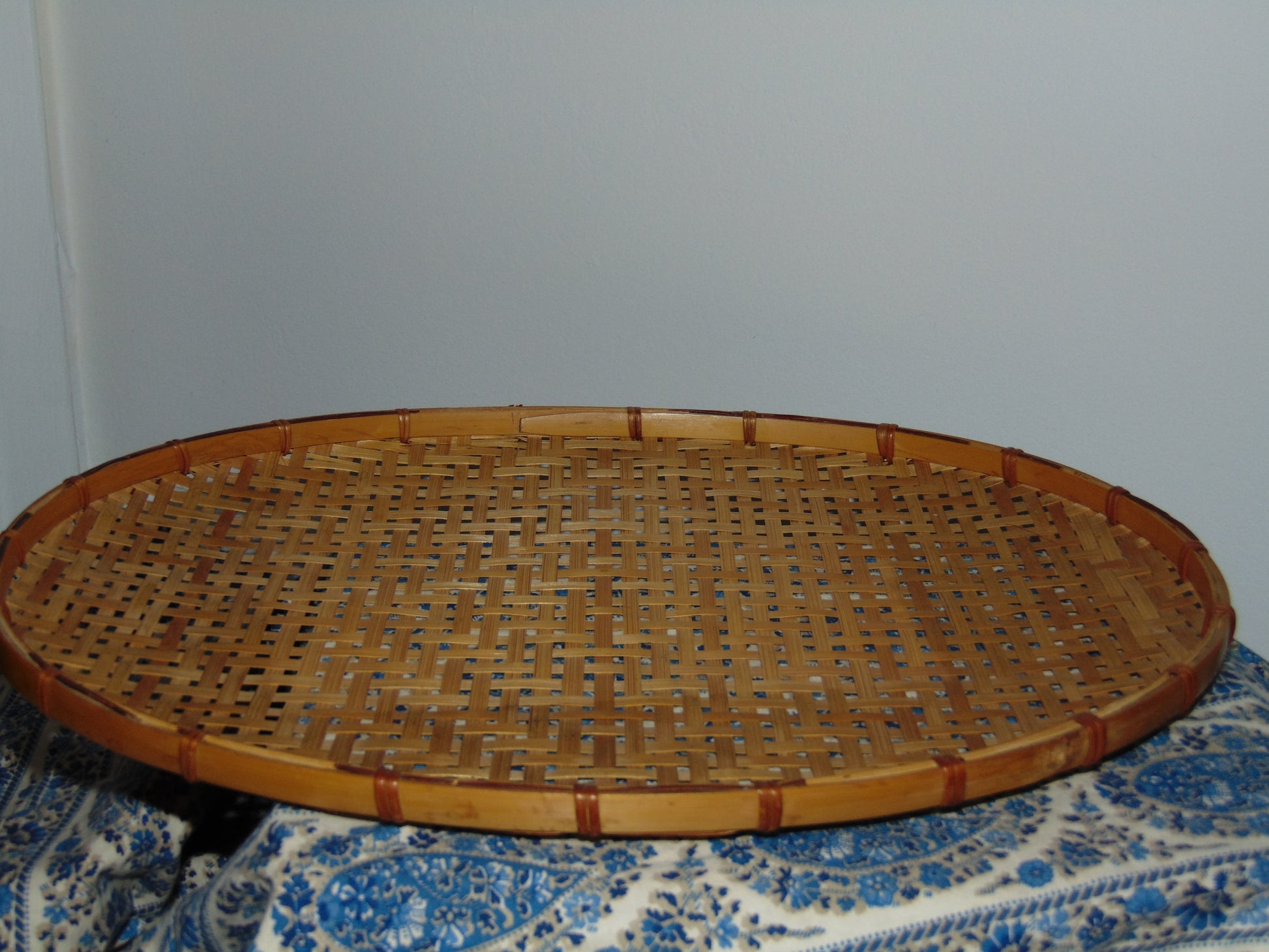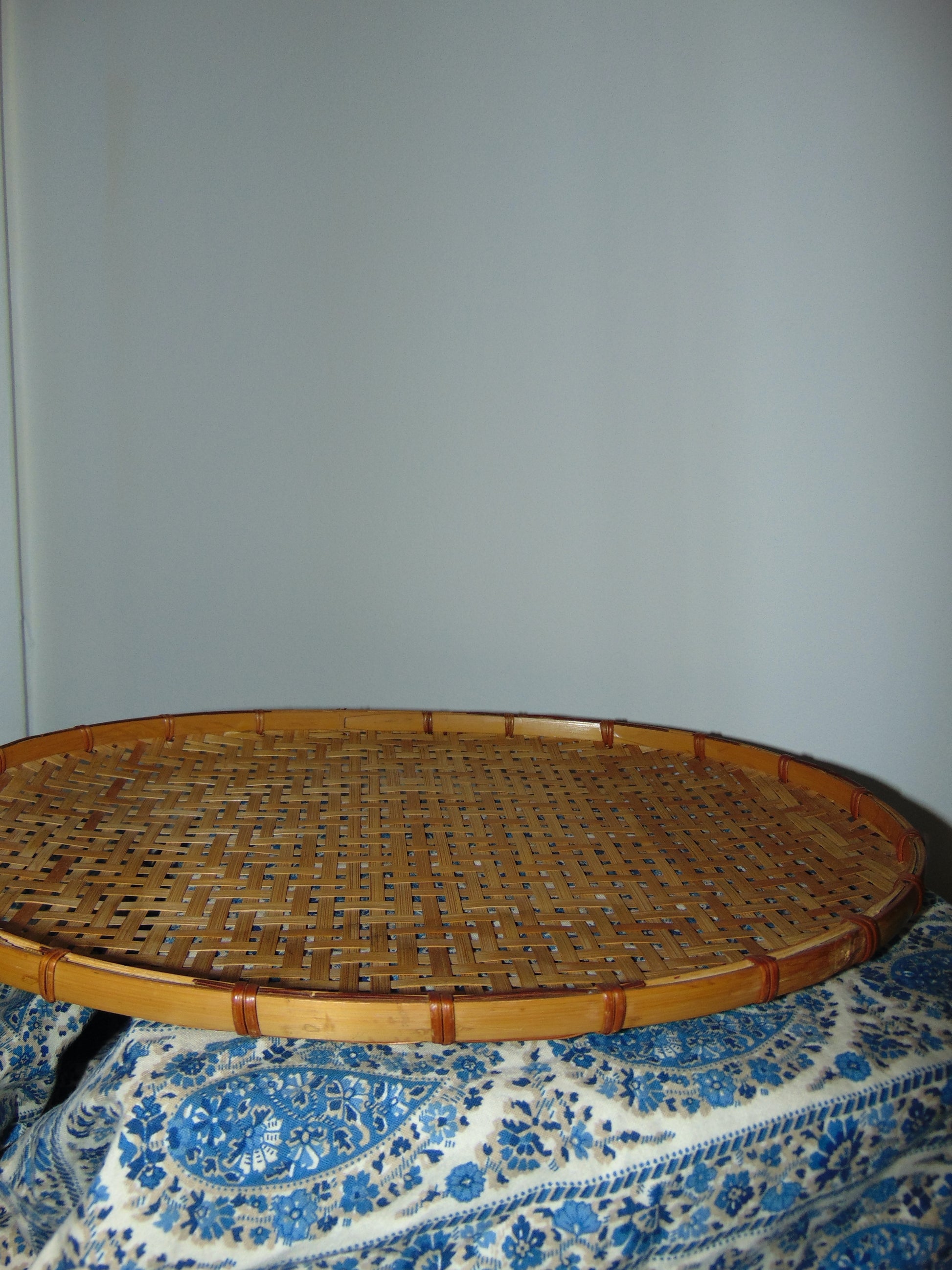 Vintage Japenese bamboo wicker, handwoven oval tray. Can be used to decorate your table setting or even hung on the wall for some textured decor. You could even make things a bit more fun and use this as a sweet jewelry hanger/display for safekeepings.