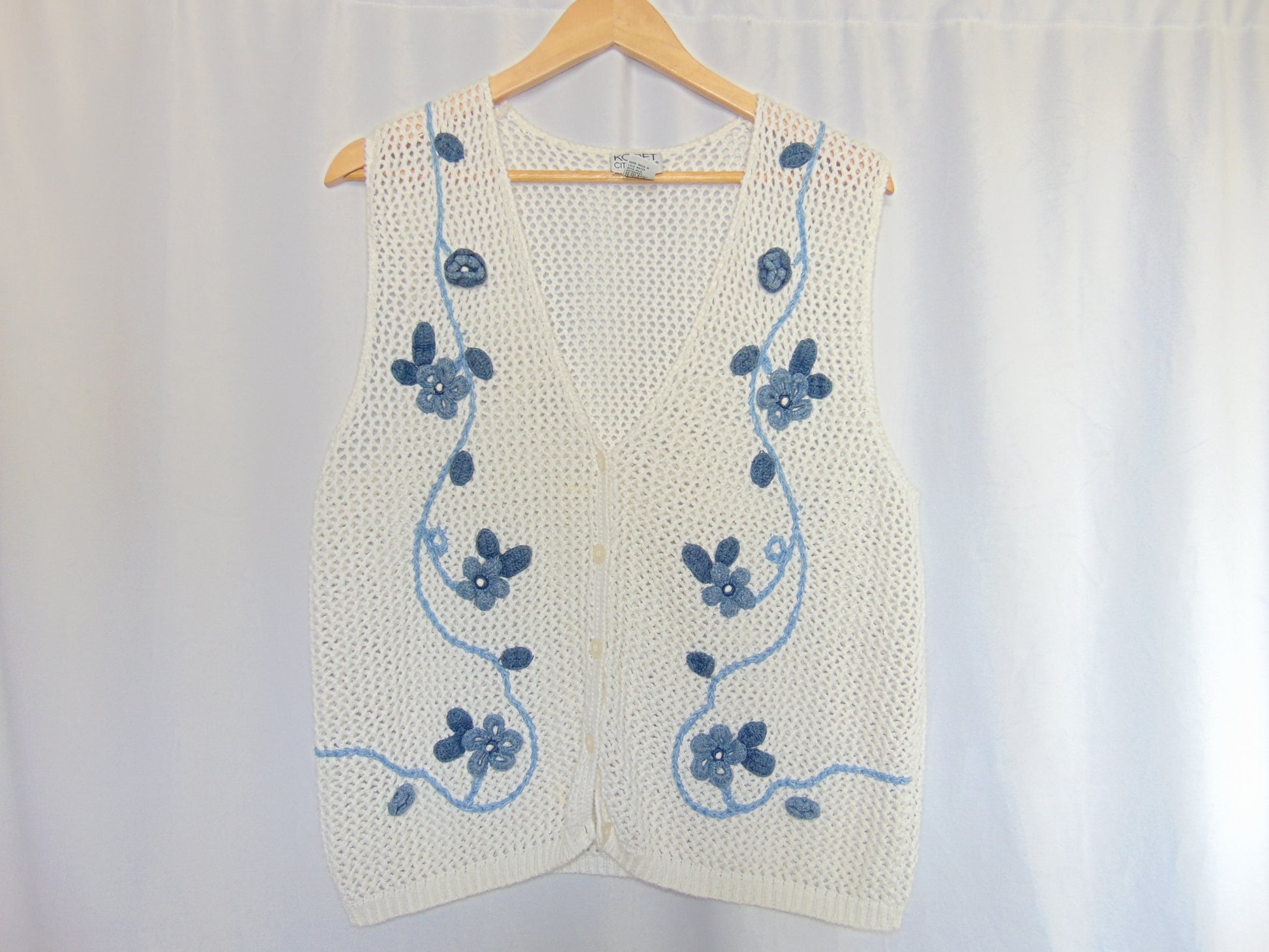 Beautiful white and hints of blue, floral knitted vest by Koret City Blues. Tagged a size L. 55% Ramie 45% Cotton.
