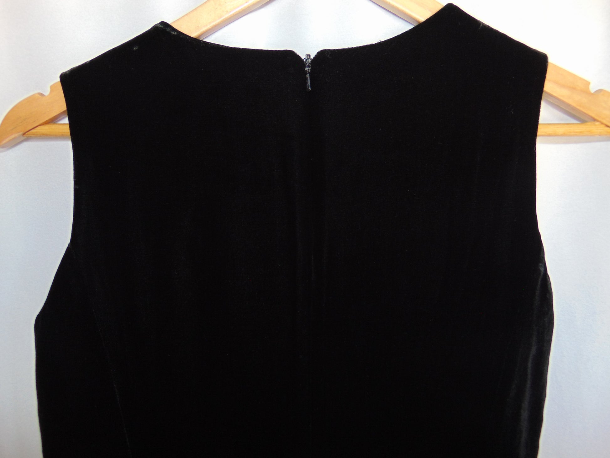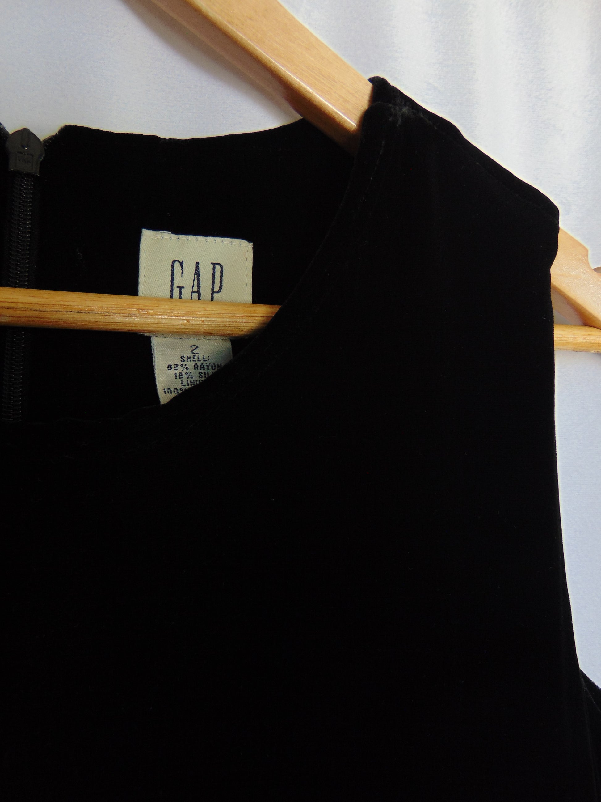 Vintage Gap black velvet, sleeveless shift dress. This dress is a classic beauty. 62%Rayon. 18%Silk. Lining 100%Acetate. Tagged a size 2.