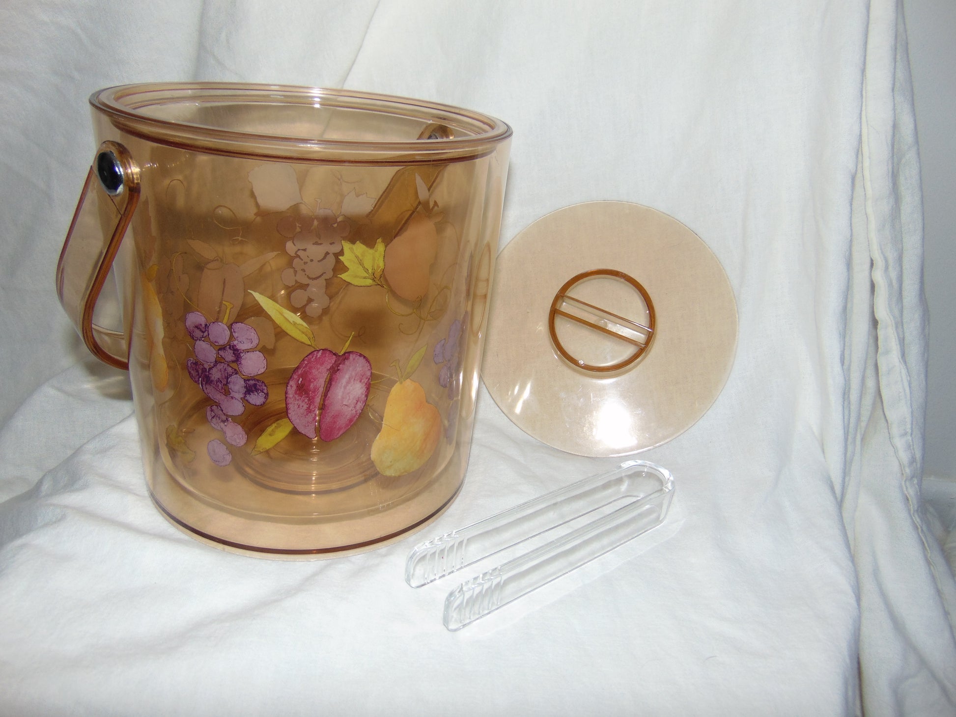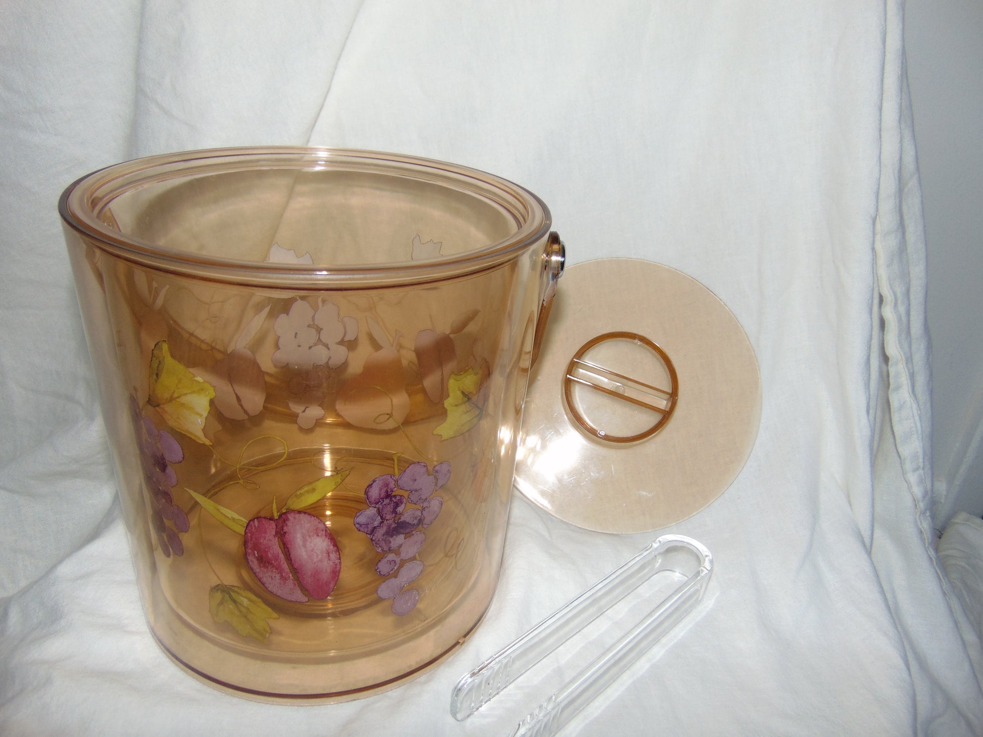Elevate your gatherings with this vintage lucite acrylic ice bucket, featuring an elegant fruit design and a removable interior bucket in a stunning amber hue. Complete with a lid/stopper and ice tongs, it combines style and functionality to keep your drinks perfectly chilled.