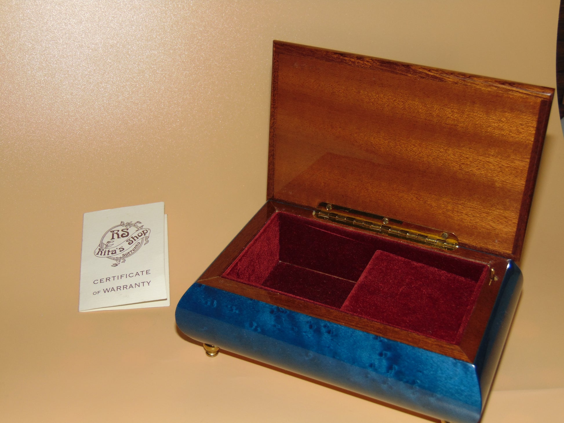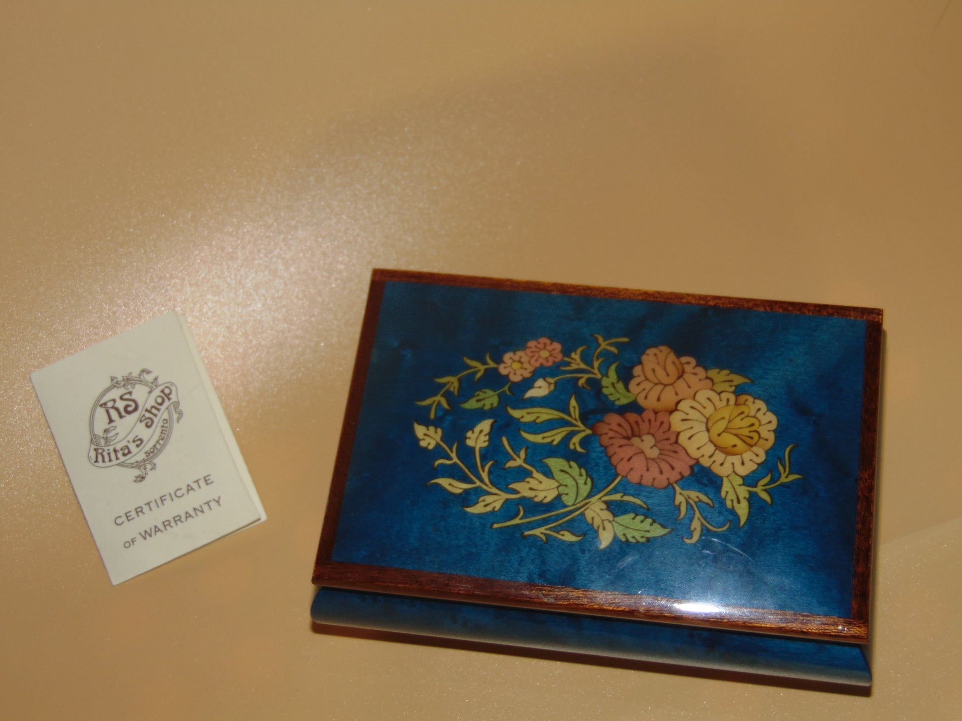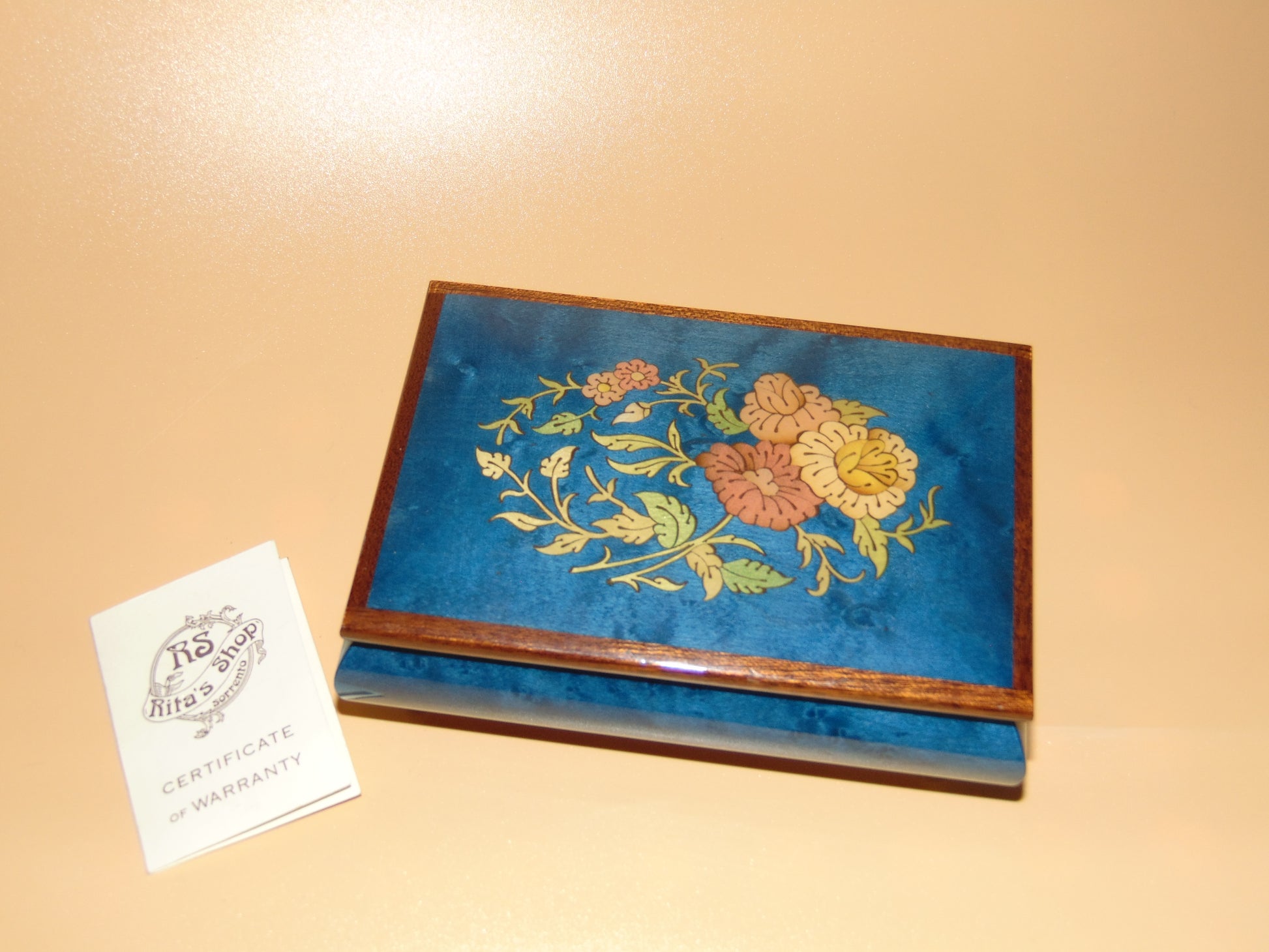 Beautiful blue vintage Italian wooden music box by Rita's shop. The details are stunning between the floral inlay and rosewood border, not to mention the soft & spotless lining.