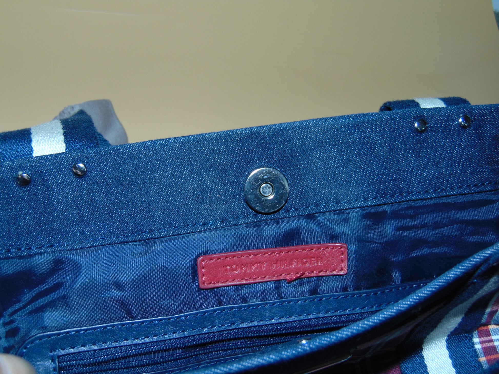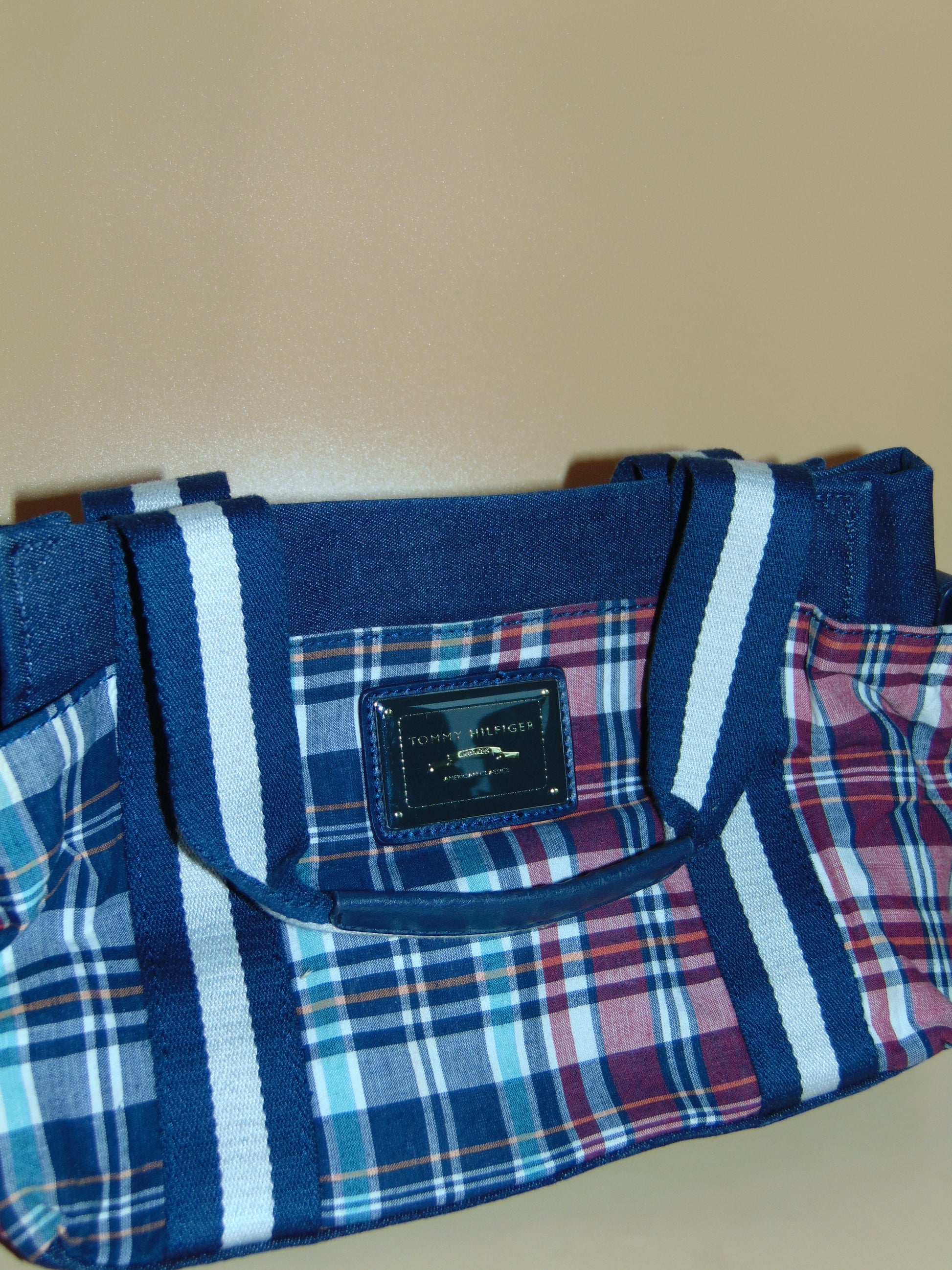 Y2K Tommy Hilfiger Madras print plaid denim & canvas purse. Plaid is blue, green, red and white with white and blue cotton straps. Magnetic snap closure with lots of pockets.